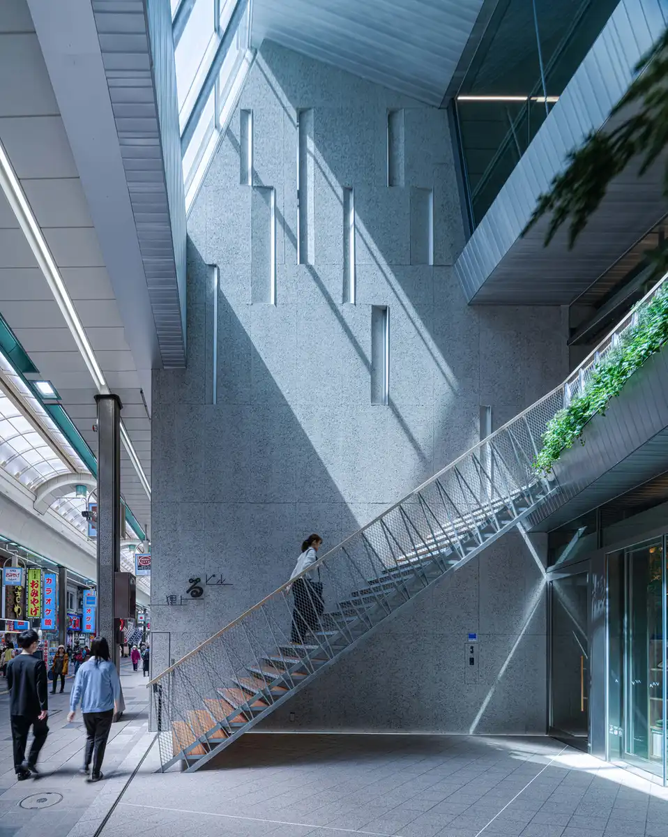 While the construction of this building incorporates innovative processes and techniques that are not visible, there are also some distinctive innovations in its visible elements. Typically, stores in shopping arcades protrude into the space of the pedestrian walkway to position their wares closer to passers-by, to grab more attention. In contrast, the Tanuki Noboru Building has set back its façade from the pedestrian walkway by a significant distance, in order to create a unique atrium space within the shopping arcade.