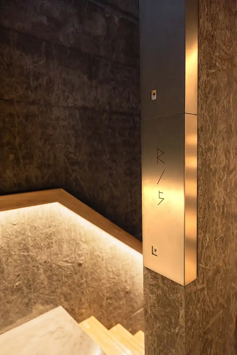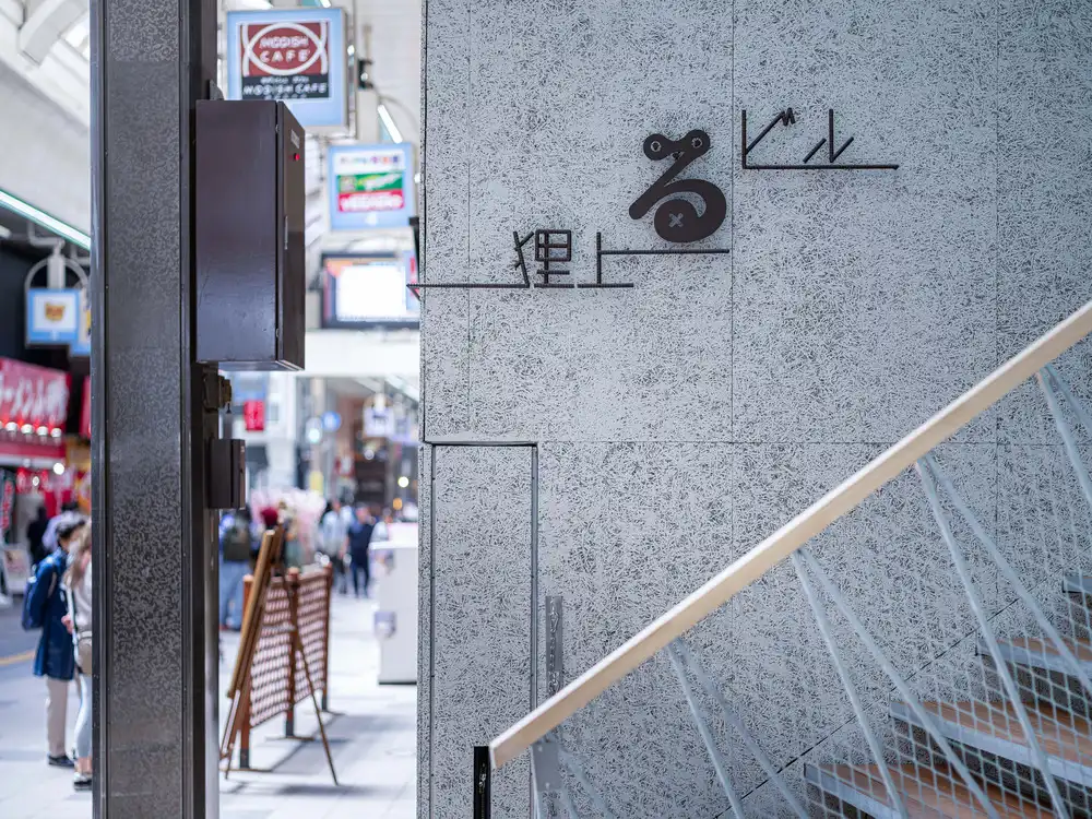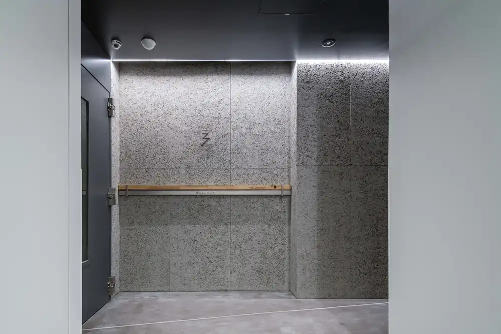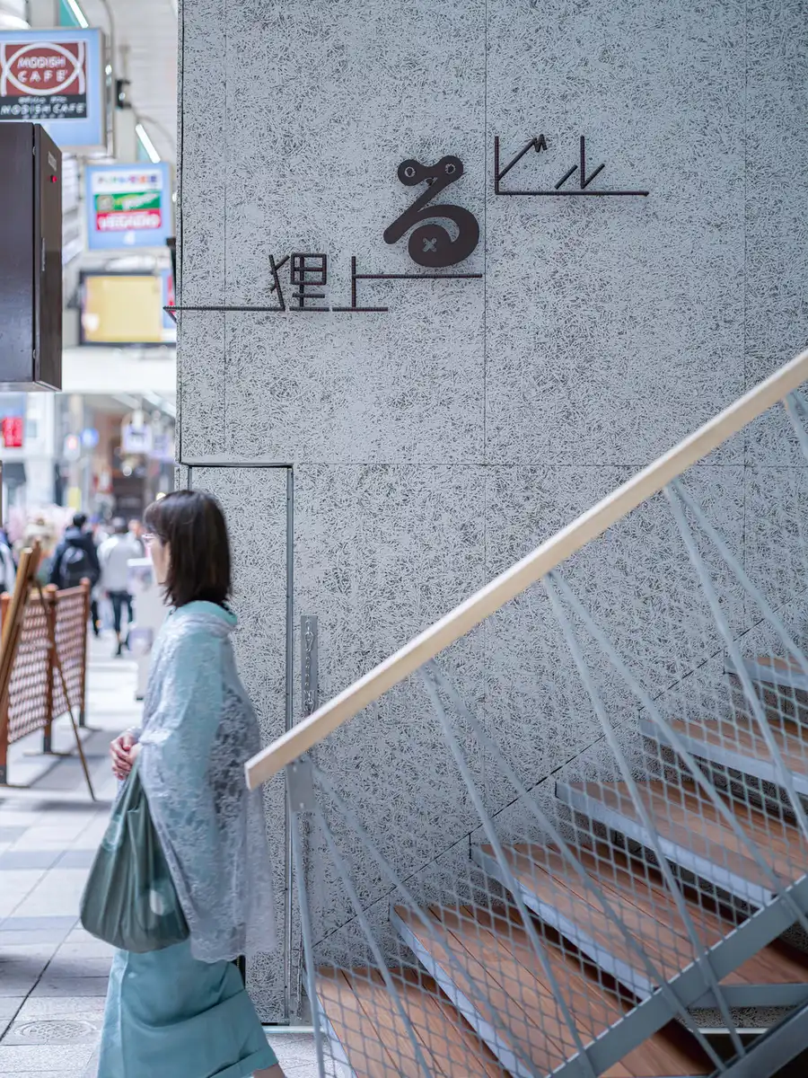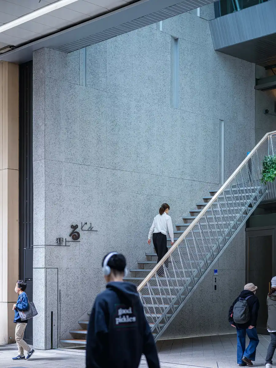 Interestingly, each tenant’s nameplate is rendered using the same crosspieces used to fix the cast-in-place formwork in position during construction. There is a myth in Japan that suggests that tanuki (raccoon dogs) are mischievous animals capable of assuming different forms and playing tricks on humans. The restroom signs, which appear different when viewed from the side and the front, embody the playful image of the tanuki in a way that suitably represents a commercial building on the Tanuki Koji Shopping Street. The hiragana character “ru” in the logo of the building’s name, Tanuki Noboru (“tanuki climbs”), is a stylized depiction of a transformed tanuki playing hide-and-seek.
