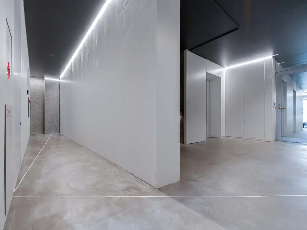 These “rays of light” on the pavement extend deep into the building as far as the elevator, and lead visitors to the entrances of each building tenant when they arrive at each floor.