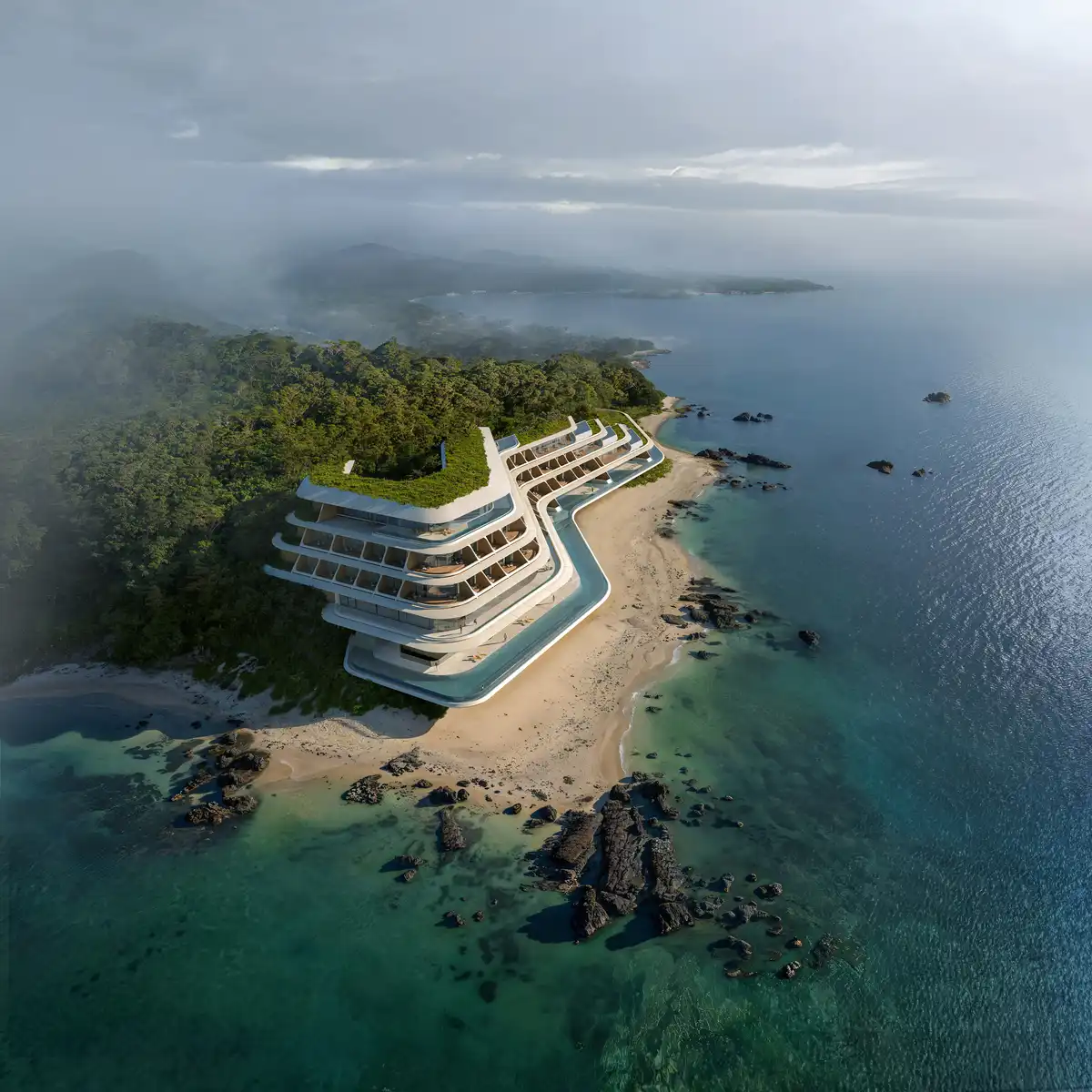 Ludovico Lombardi, ZHA Project Director, explains: “Informed by the site’s remarkable topography, the design is a continuation of ZHA’s ongoing research of composition and materiality that is driven by explorations of landscape formations evident in nature. The stepped canopies of the hotel gently transition from the unique geology of the shoreline to the dense vegetation of the rain forest—giving uninterrupted views of the ocean and a deep connection to the surrounding environment, while providing a sense of privacy that enriches user experience and charts a journey through the varied natural ecosystems of the region.”