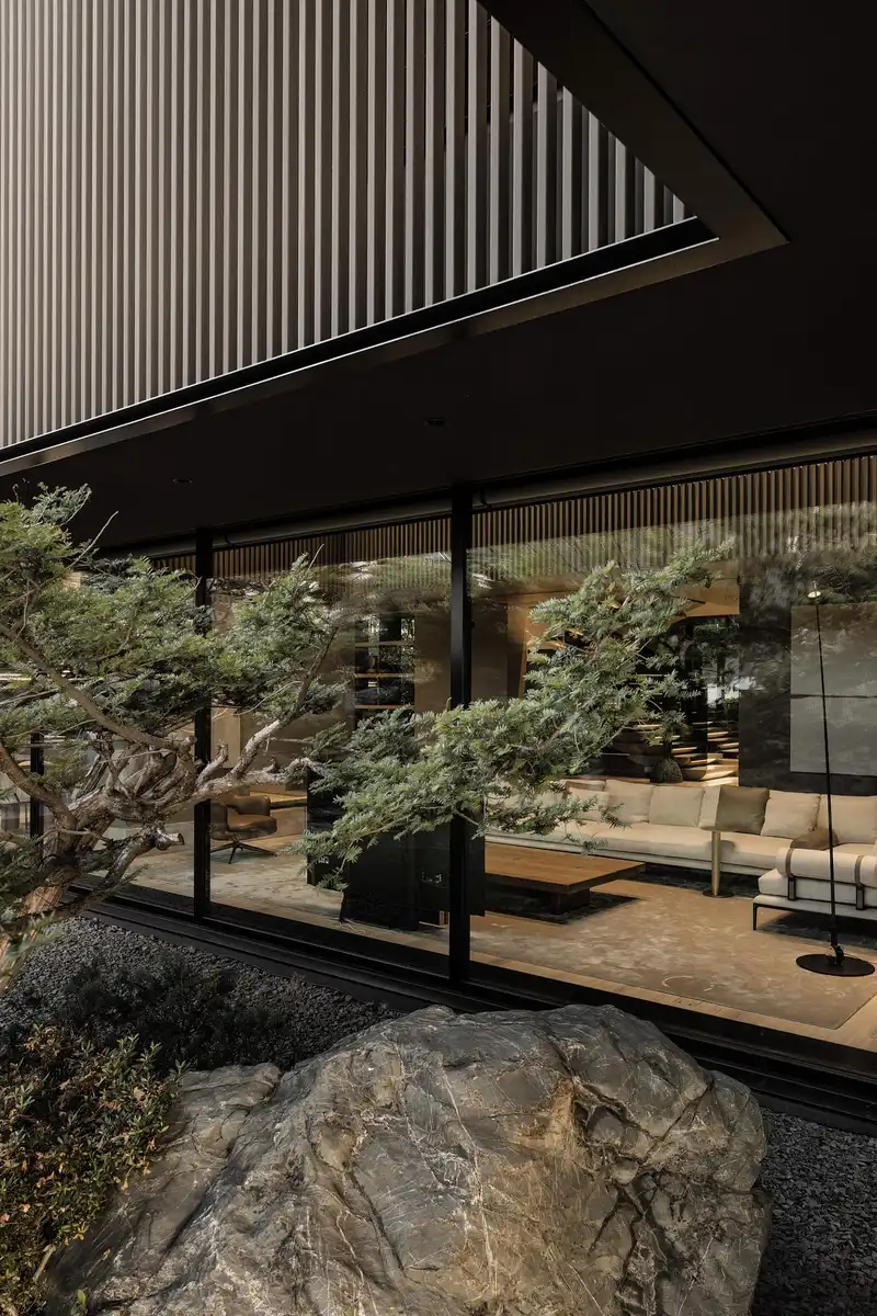 A polished forest rock, placed in a symbolic garden and visible through expansive glass walls, anchors the home spiritually and visually.