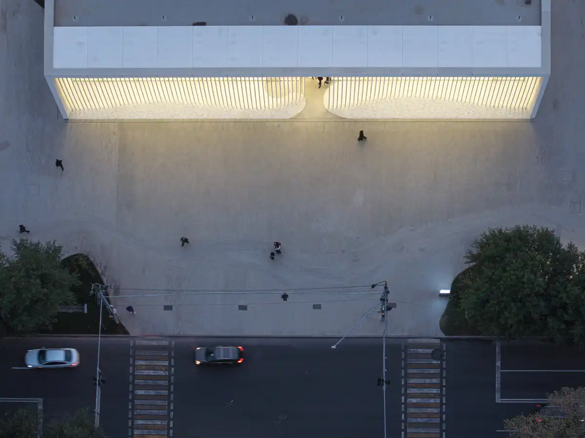 As part of the reconstruction, the floors of the entire ground level were lowered to remove all internal level changes. The four steps at the main entrance were eliminated, establishing a single continuous ground plane that flows outwards in all directions into the surrounding landscape. This surface forms a literal ground for public life and a metaphorical steppe, linking the building to Kazakhstan’s vast natural horizons.