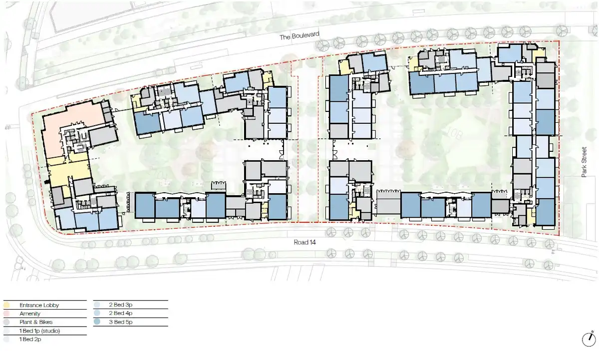 Buildings range between 6 and 15 storeys, in line with the outline consent, creating a varied roofscape while maximising sunlight into the courtyards. Parking is concentrated along the central spine road and small parking courts, while generous cycle storage and residents’ facilities support sustainable living.