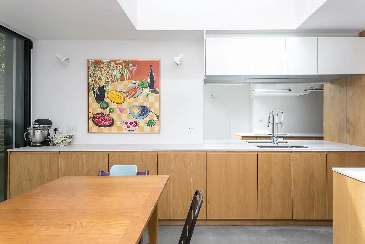 A mirrored splashback doubles the sense of space in the kitchen, which is spatially delineated by sculptural composition of rectilinear timber cabinets. The staircase to the ground floor appears as an abstracted form in the ceiling of the lower-ground floor, referencing the appearance of this feature in the early twentieth-century houses of Adolf Loos.