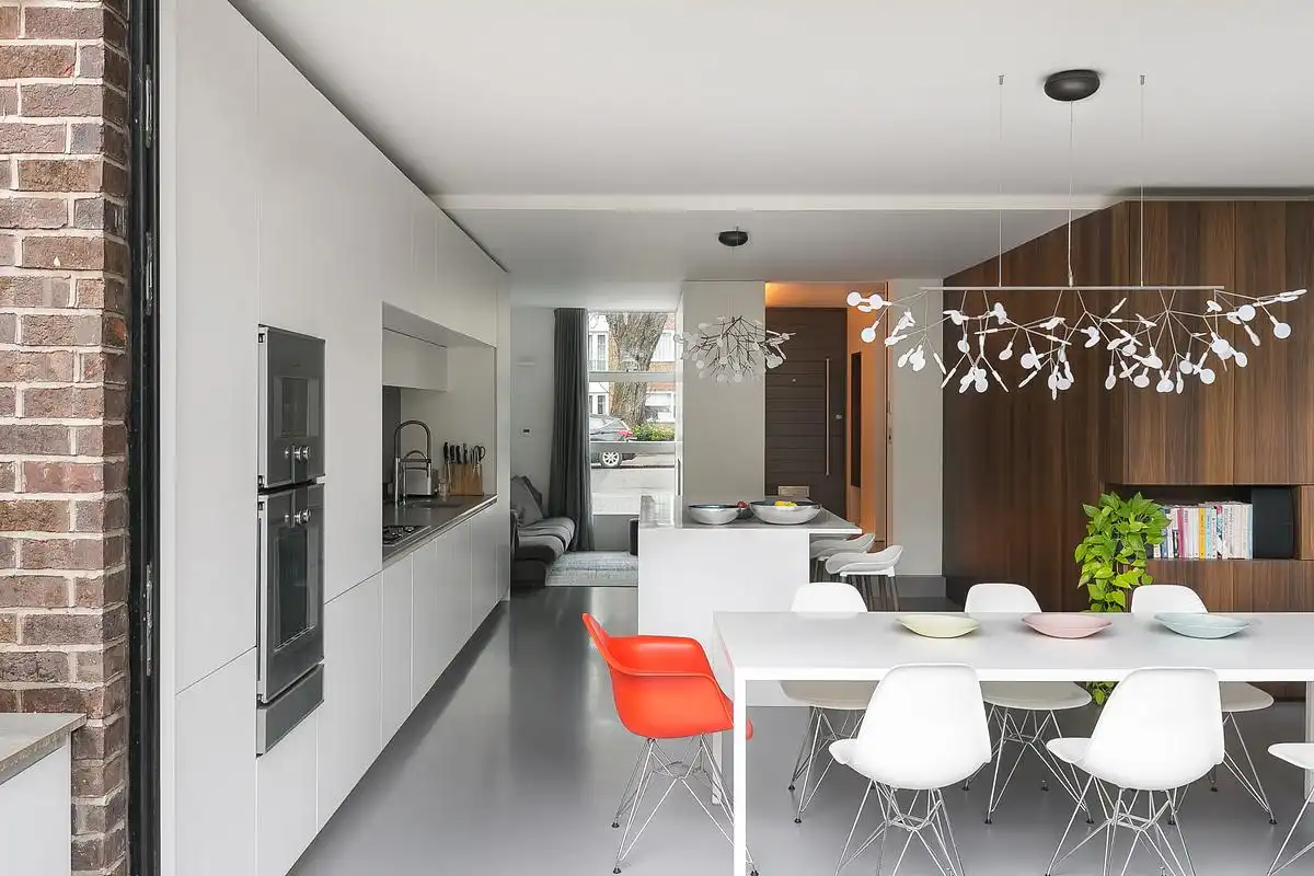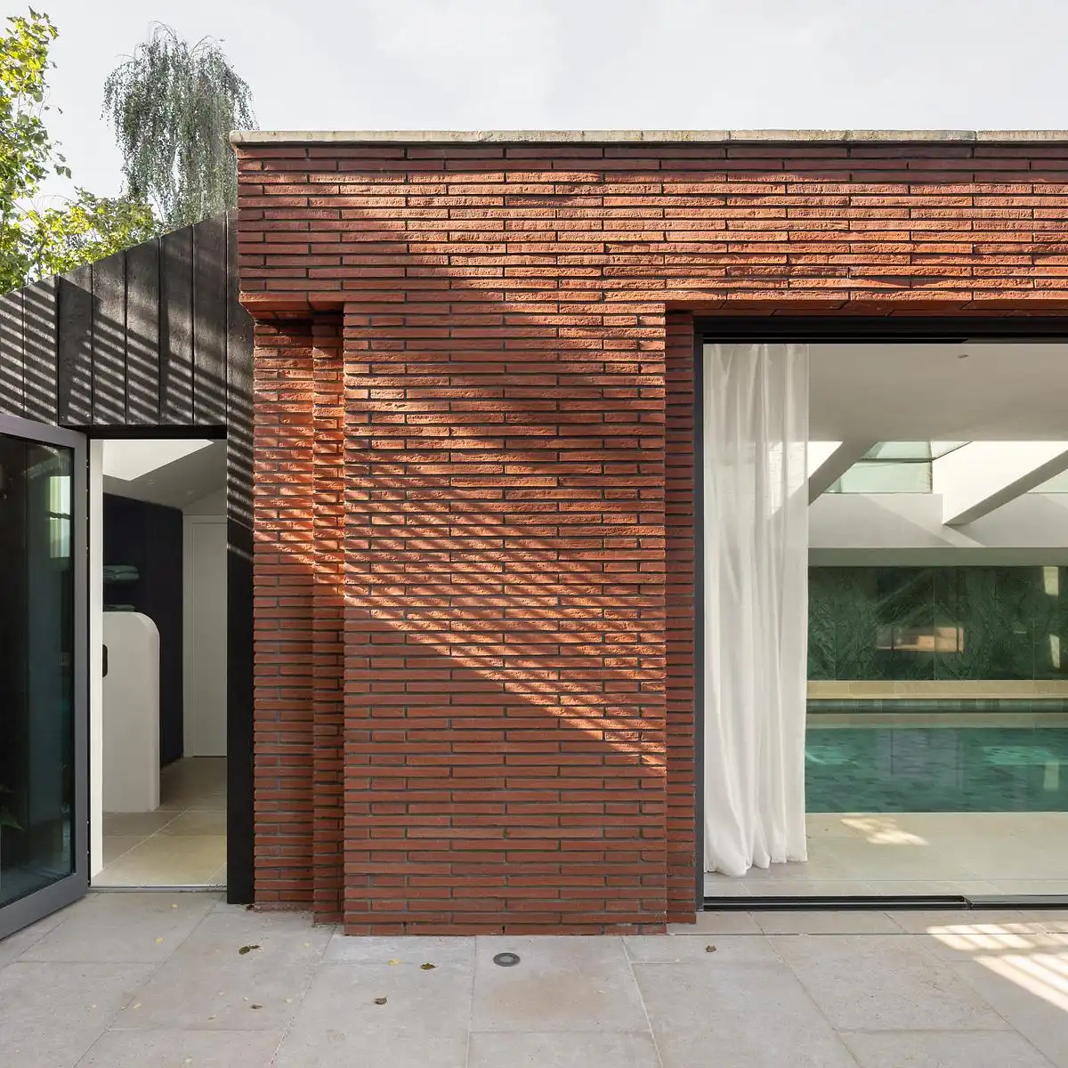 Due to the proximity of the surrounding mature trees, the pavilion is built on pile foundations. Handmade bricks were chosen for the external walls to harmonise with the rear façade of the main house, and the. Their characteristic length, variation and surface movement – a result of varying firing temperatures – emphasises the diverse textures and shades. The choice of brick is also a nod to a traditional brick folly, detailed here in a contemporary way.