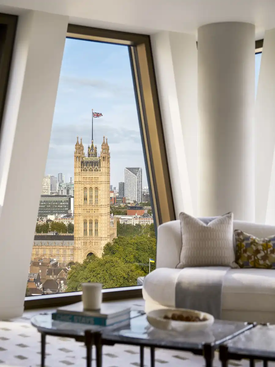 Enhancing modern city living in St. James’s Park, the design blends contemporary architecture with thoughtful interiors. Lateral apartments, duplexes, and penthouses, with ceiling heights ranging from 2.7 metres to 6 metres, each complete with floor-to-ceiling glazing that offers panoramic views of Westminster Abbey, Big Ben, Buckingham Palace, and the London Eye. Internally, each home is delivered to the highest specification, featuring wide plank timber floors throughout, kitchens fitted with Bardiglio Italian marble worktops and equipped with Miele and Gaggenau appliances, as well as marble-finished bathrooms. Sophisticated Lutron lighting controls and integrated Creston home systems are complemented by underfloor heating and comfort cooling throughout.