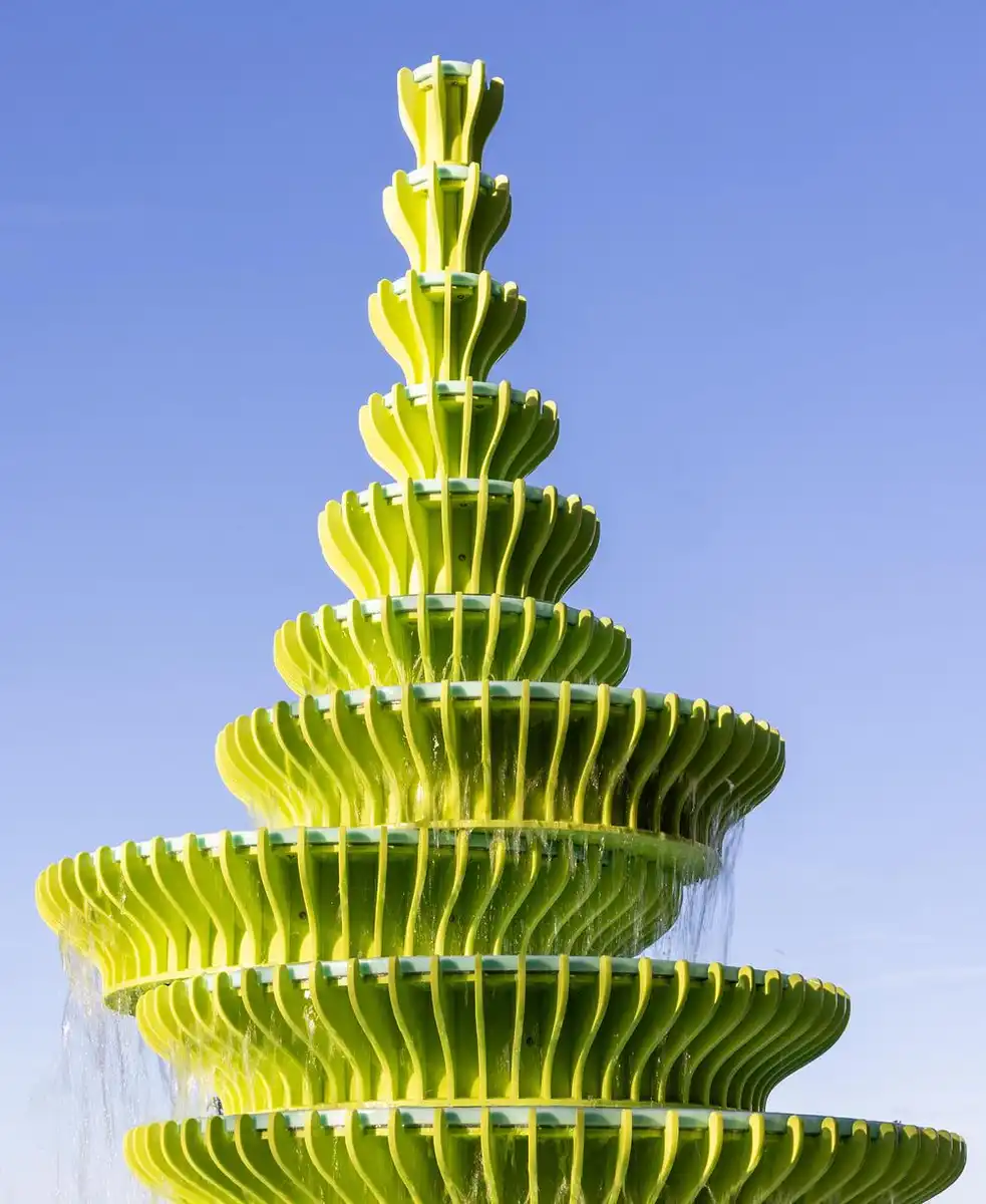 Material selection was driven by performance and longevity. HI-MACS was chosen for its durability, colour stability, and ability to form the exact geometries required for the stacked plates and fins. Its long lifespan and weather resistance minimise future maintenance. The chosen palette—green for the vertical elements, echoing the surrounding landscape, and turquoise for the water tables, referencing the colours often associated with water—seamlessly grounds the sculpture in its setting.