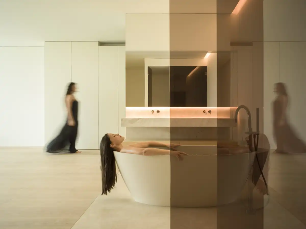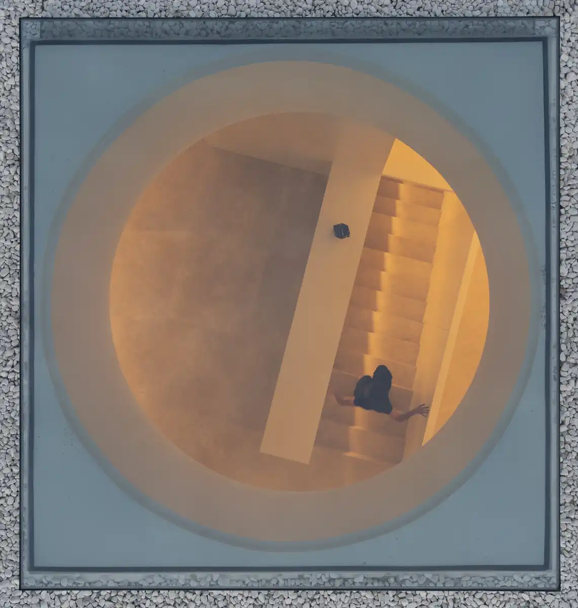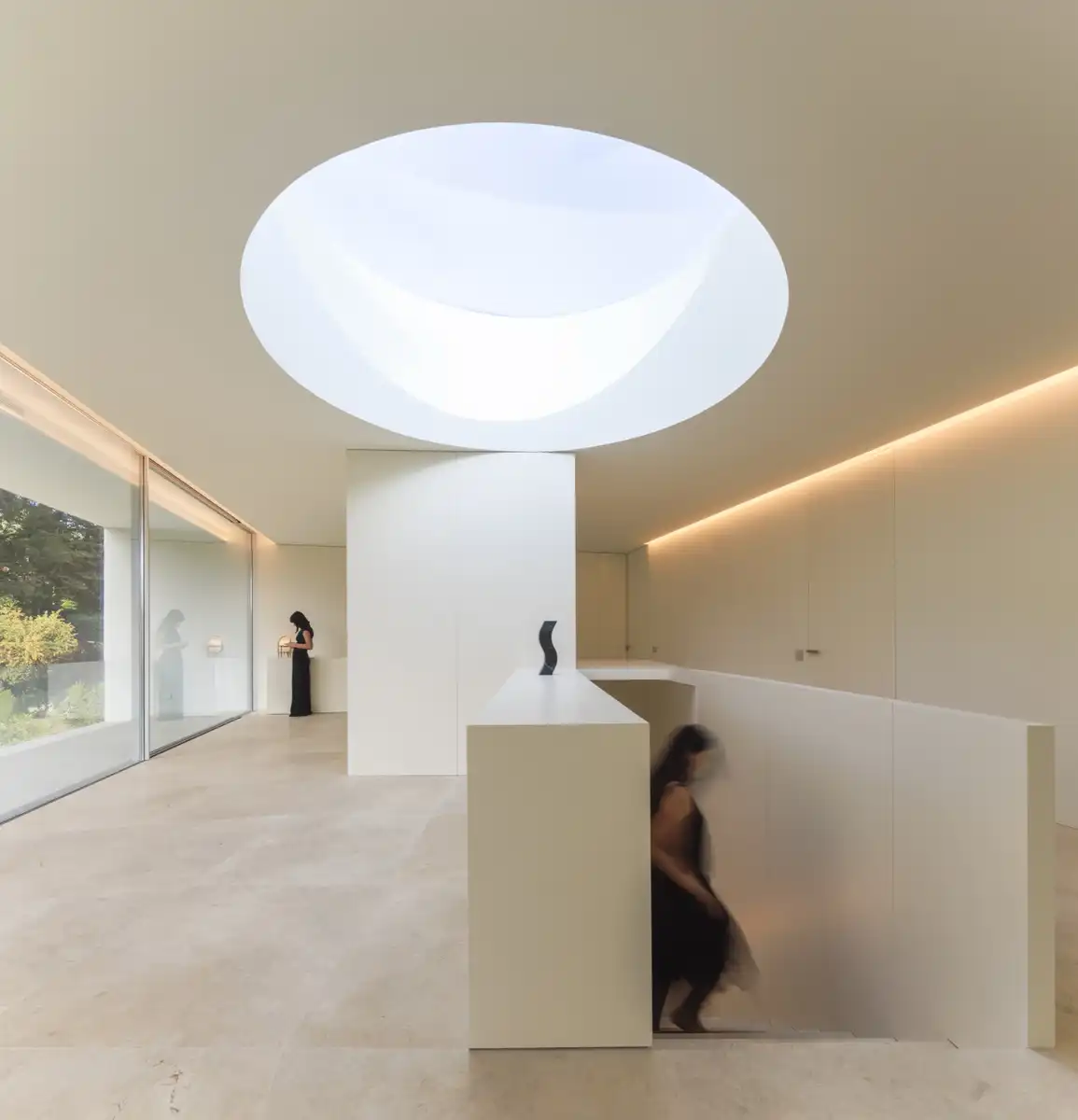 The rotation of the volumes is also expressed in the circular skylight on the upper floor, executed from a single piece. In the basement, the garage and spaces dedicated to wellness and health are located, naturally illuminated through a skylight, as required by the area’s urban planning regulations.