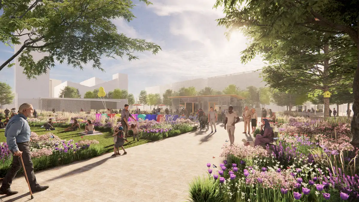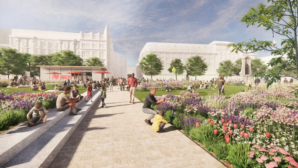 Piccadilly Gardens Manchester renewal design, City square development images, England urban landscape news