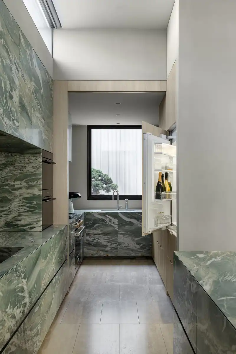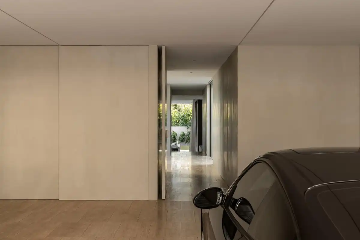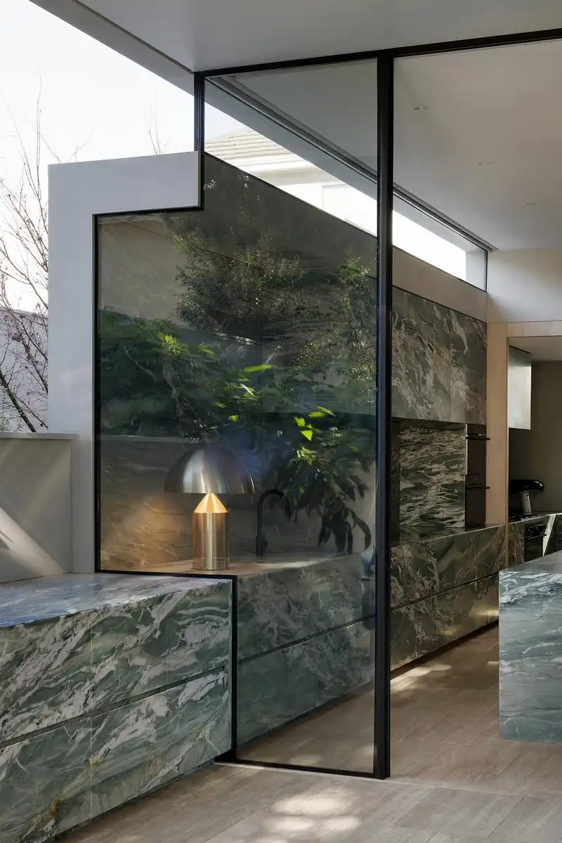 Internally, the house unfolds as a series of finely crafted volumes. A split-level ground floor connects garage, entry and office to sunken living spaces and an expansive kitchen clad in rare Seafoam Ocean-Waves quartzite. Upstairs, bedrooms, en-suites, and a library enjoy access to light and borrowed green outlooks. Sculptural stairs, travertine floors, and refined finishes contribute to the spatial elegance.