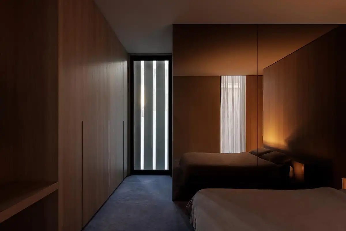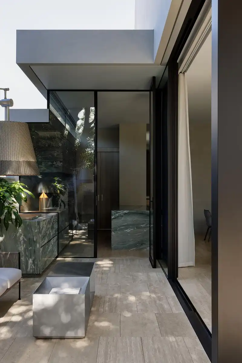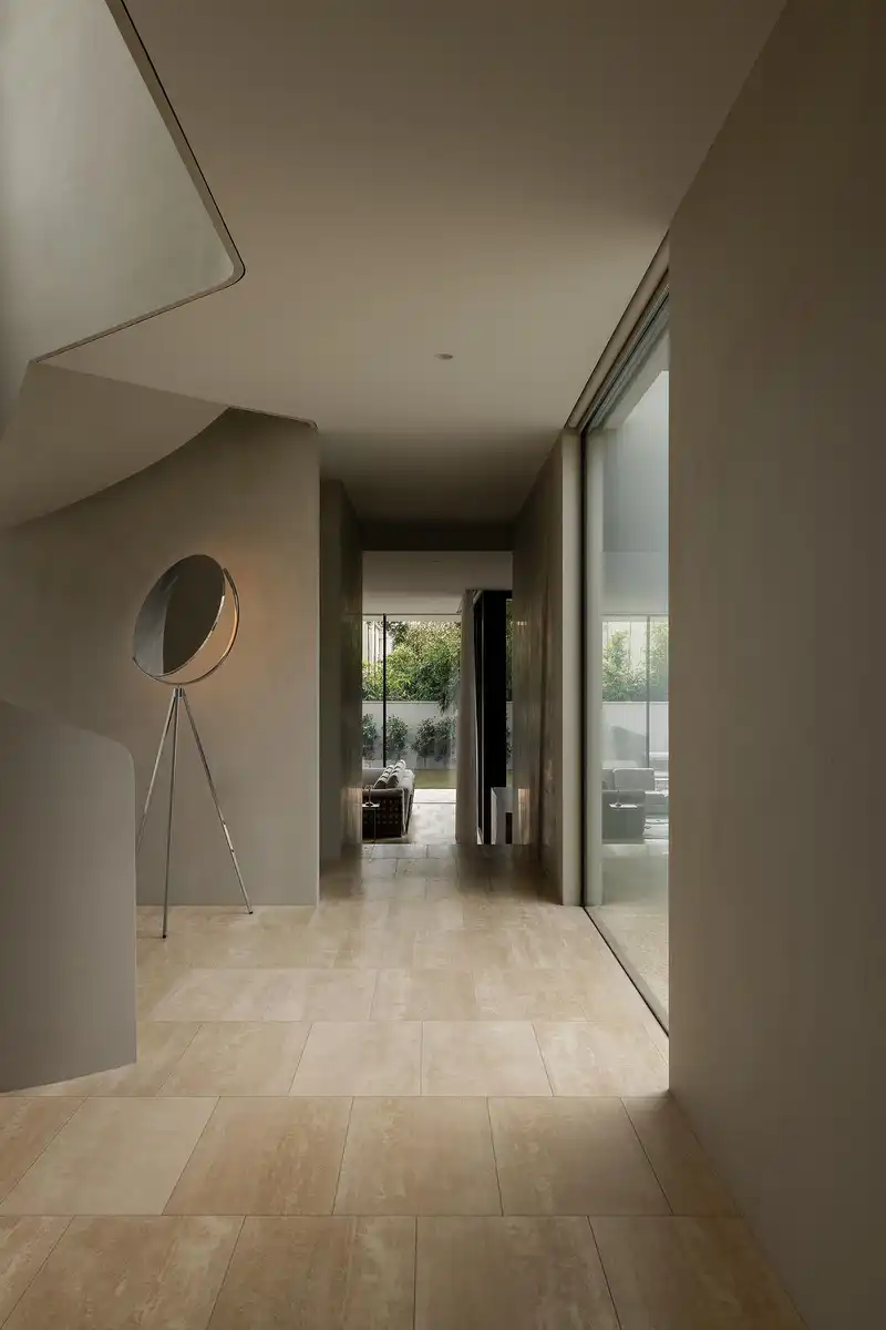 Natural light filters through courtyards, skylights, and panoramic windows, reinforcing a sense of serenity and flow. The architecture engages with the public realm subtly—through a street-facing olive tree and shimmering curtains—quietly generous, yet unapologetically modern. The result is a house that offers sanctuary without retreat, and speaks to both street and occupant with clarity and care.