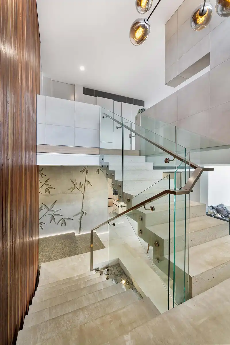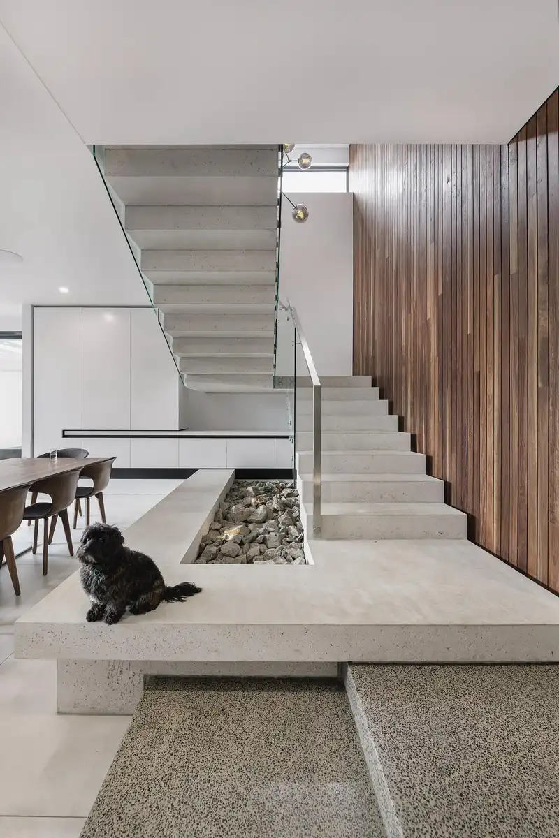 The interior showcases concrete’s versatility, from a “floating white concrete stair” to its interaction with natural light, while timber is introduced as a “counterpoint.” How did you explore concrete’s diverse applications within the home, and what was the design philosophy behind using timber to balance its robust expression?