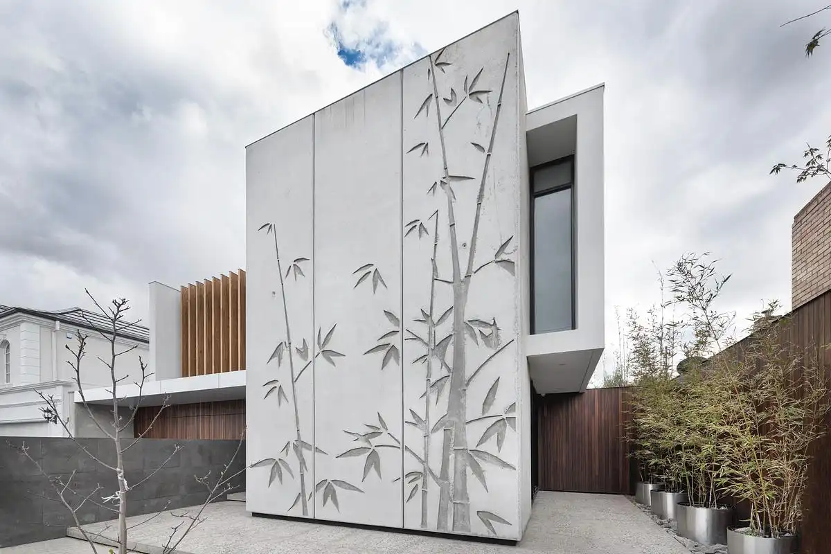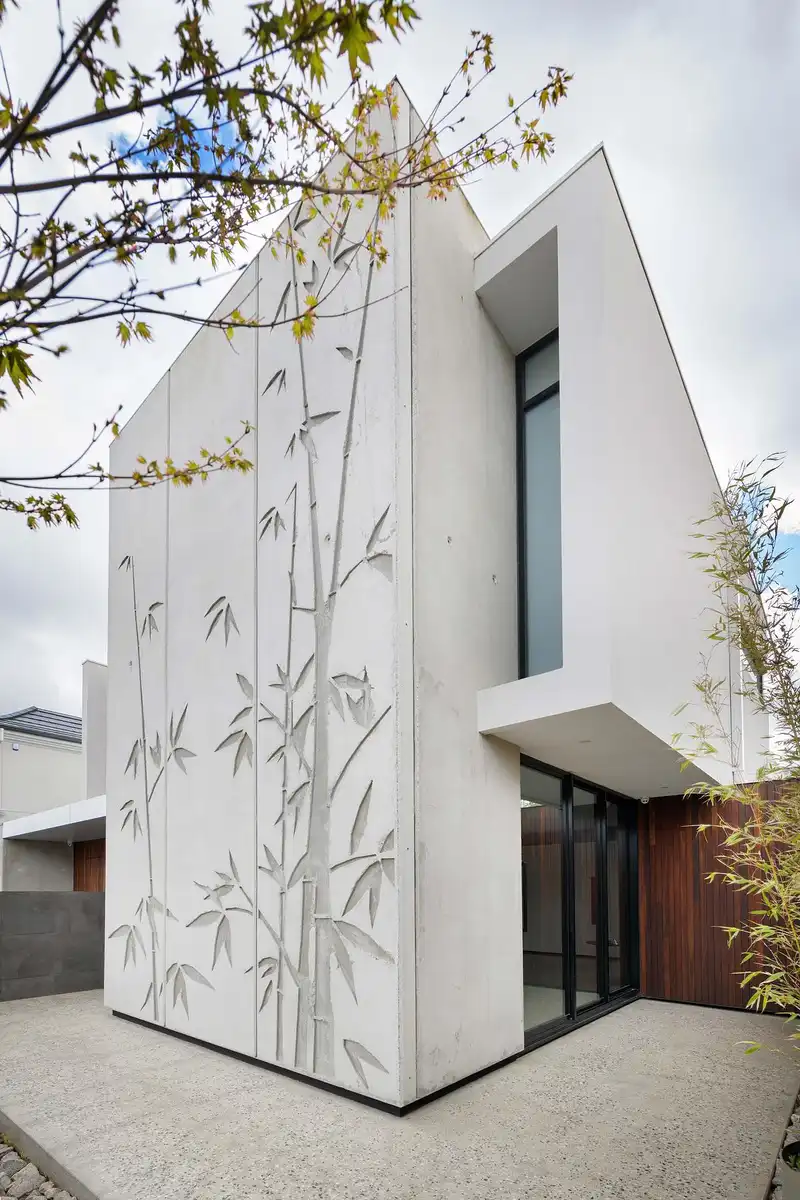 Externally, the architecture is defined by tilt-up concrete panels, cast with an abstracted bamboo relief. These panels establish the house’s primary identity: simultaneously monumental and ornamental, their industrial weight is tempered by the organic imprint of nature. This motif is not restricted to the exterior; instead, it permeates the interiors, establishing a continuity that deliberately destabilises the conventional boundary between outside and inside.