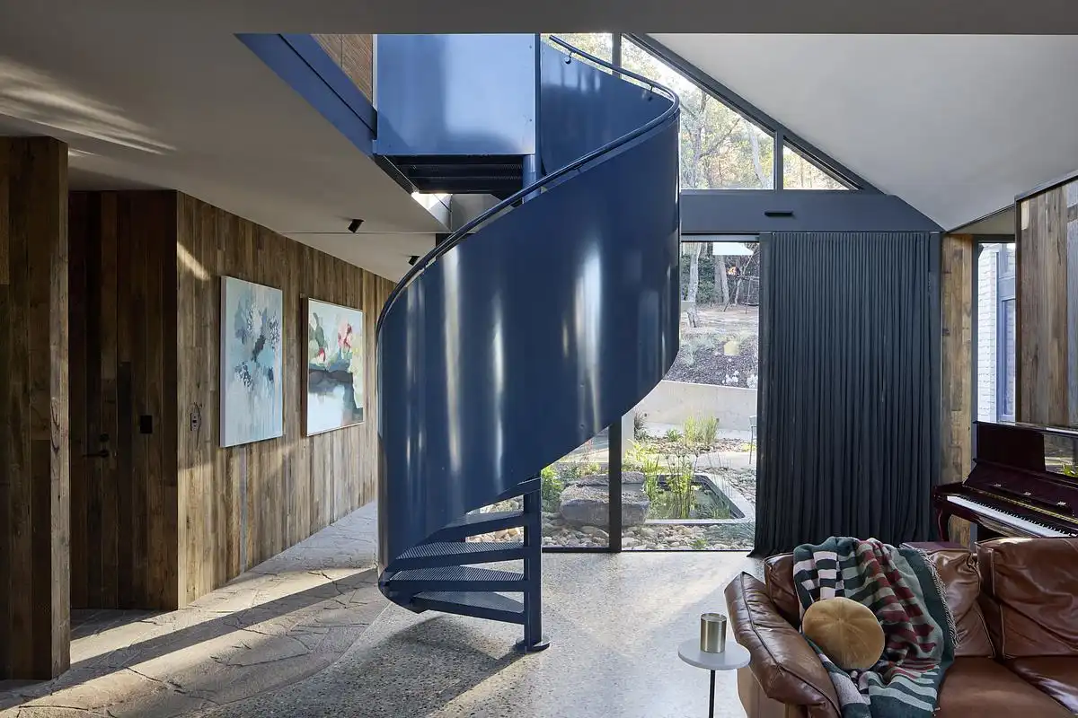 Rather than a singular architectural gesture, Korinda House is a constellation of masonry forms scattered across the slope. These solid ‘blocks’ are clad in raw, earth-toned timbercrete — tactile, robust, and weathered like the bush itself. They shelter the private rooms – a painting studio, a master bedroom suite, children’s bedrooms — each carved with generous daybed nooks that gather midday sun. Inside, these volumes soften – v-groove boards, expressive wallpapers, and recycled timber floors lend warmth and intimacy.