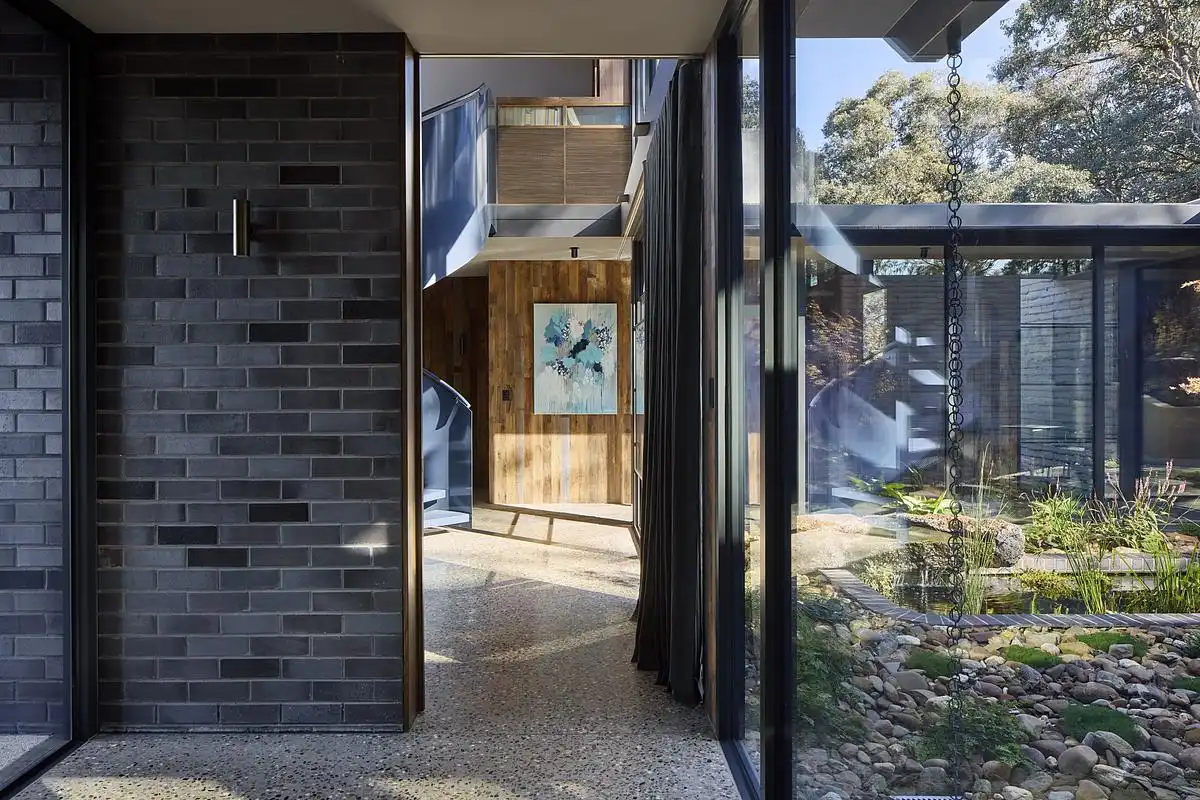 The spaces in between are where the house breathes. These interstitial zones — for cooking, dining, gathering — are transparent and tactile, defined by rough-sawn hardwood, exposed brickwork, polished concrete floors and brick pavers that flow from inside to out. The pavers rise to form steps, edge courtyards, and hold the hearth — grounding the home in its topography. The architecture here is fluid, generous and outward-facing, allowing daily life to move freely between indoors and the land beyond.