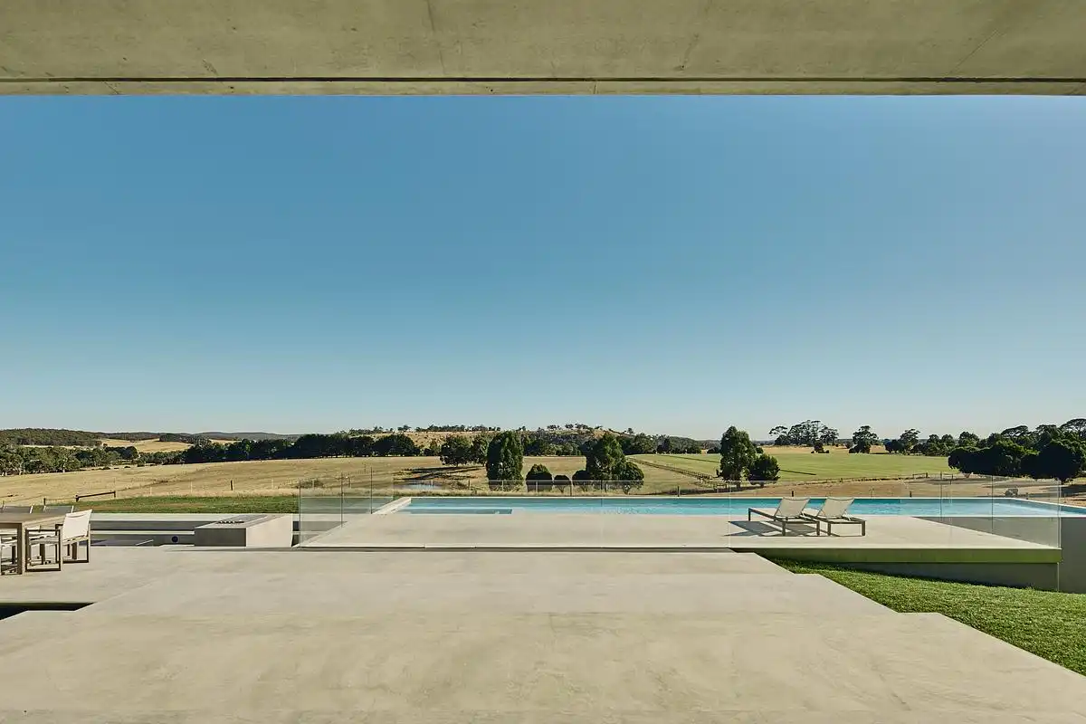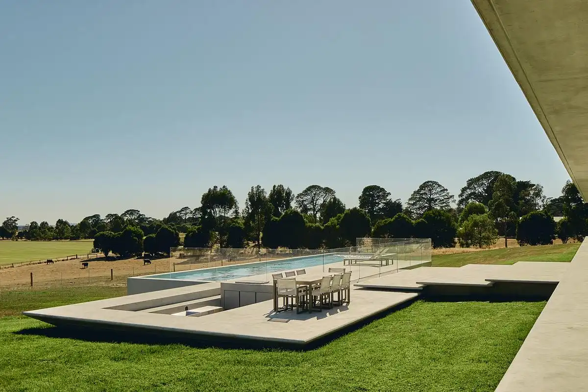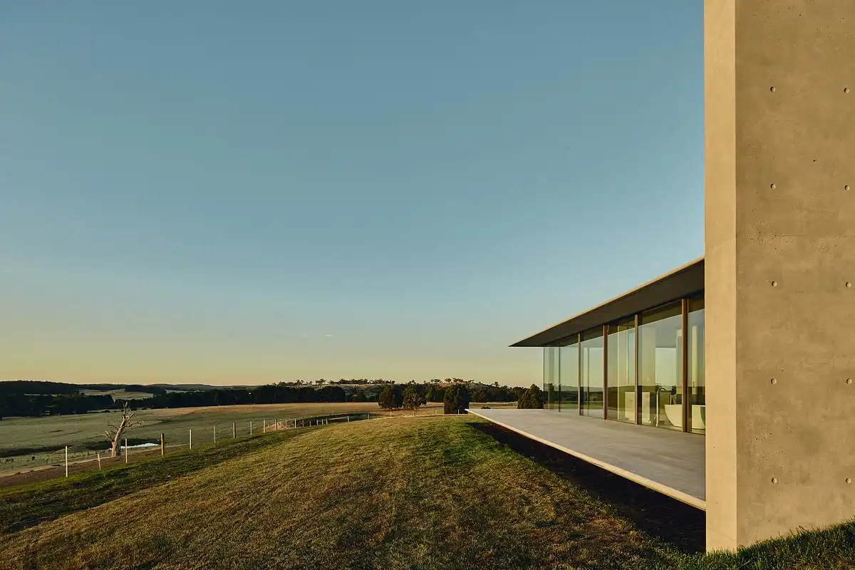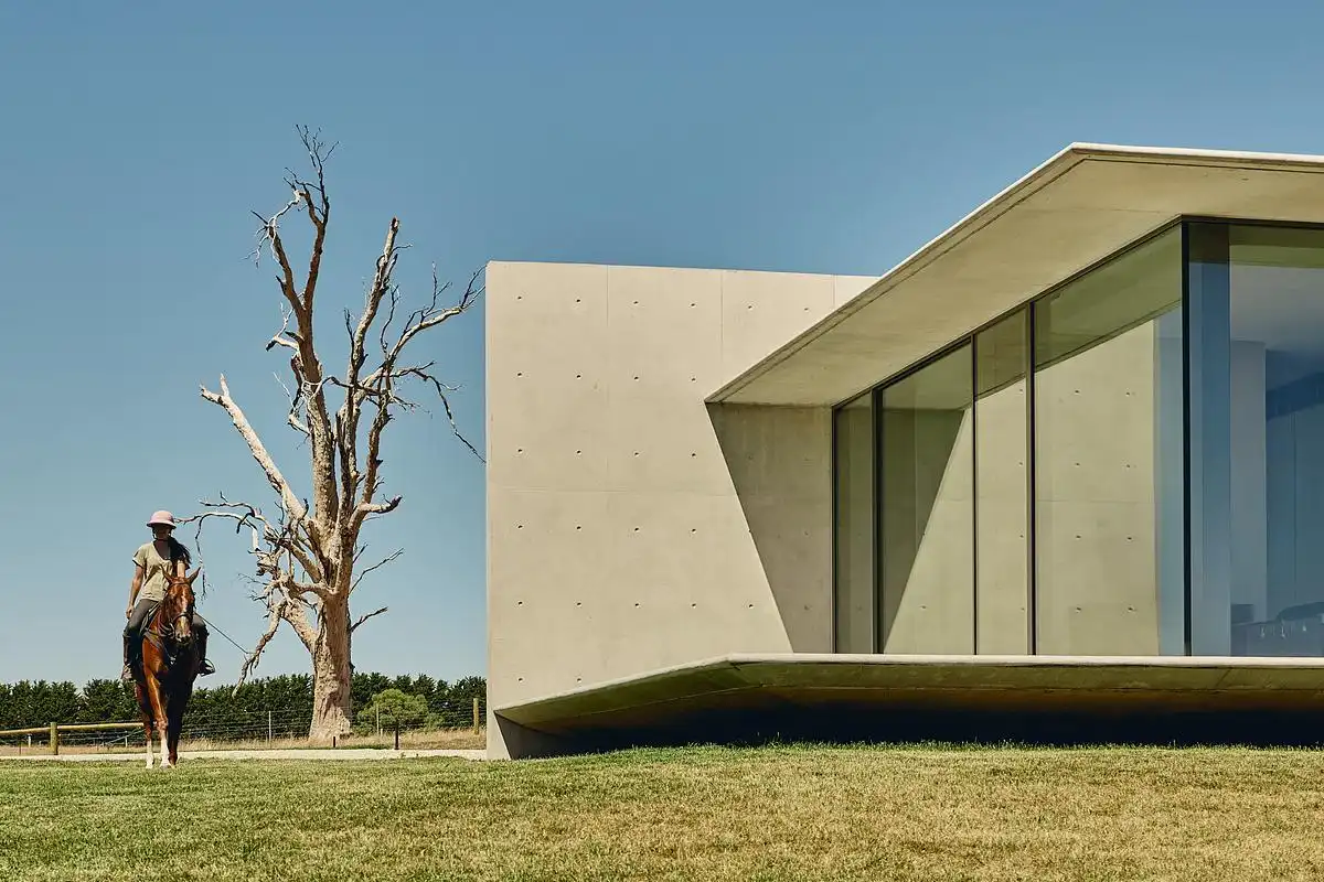 Anchored to the south and open to the north, east, and west, the home’s floor-to-ceiling glazing and floating concrete deck blur boundaries between interior and exterior, enhancing connection to the surrounding polo field and eucalypt-dotted terrain.