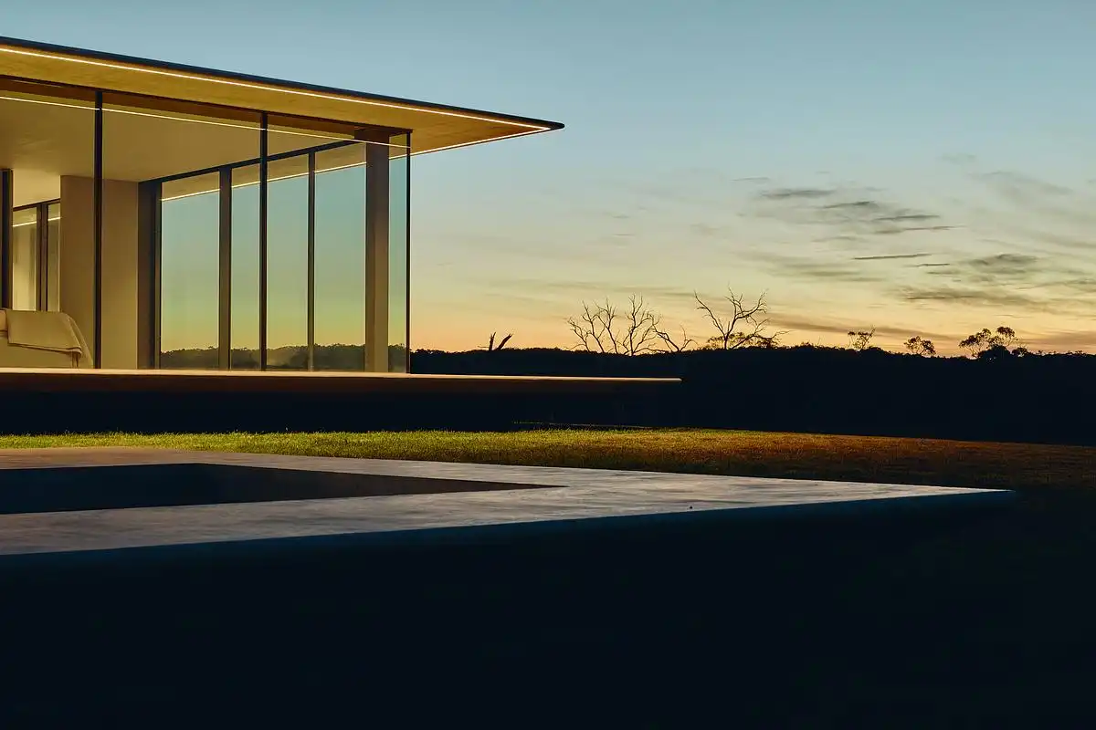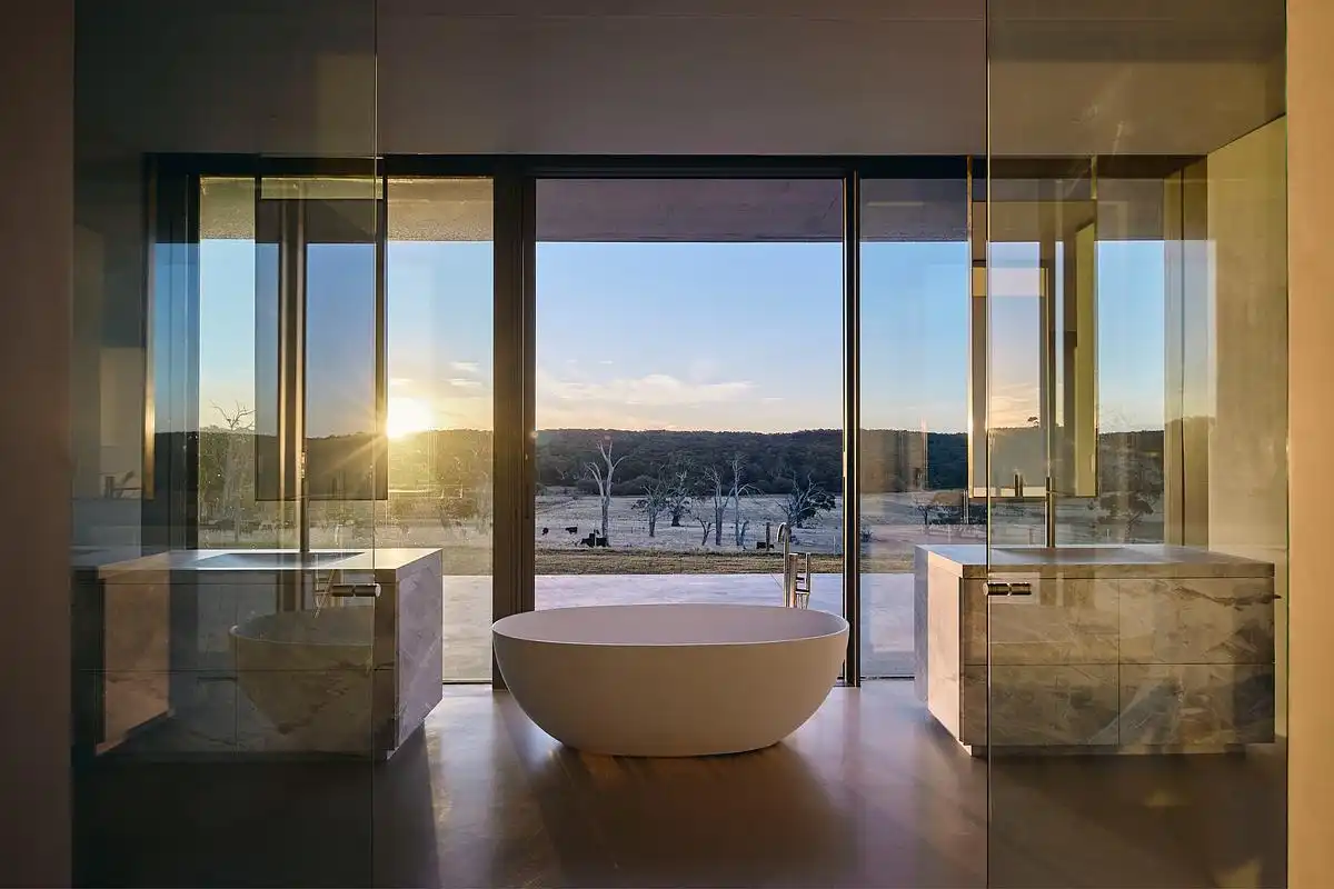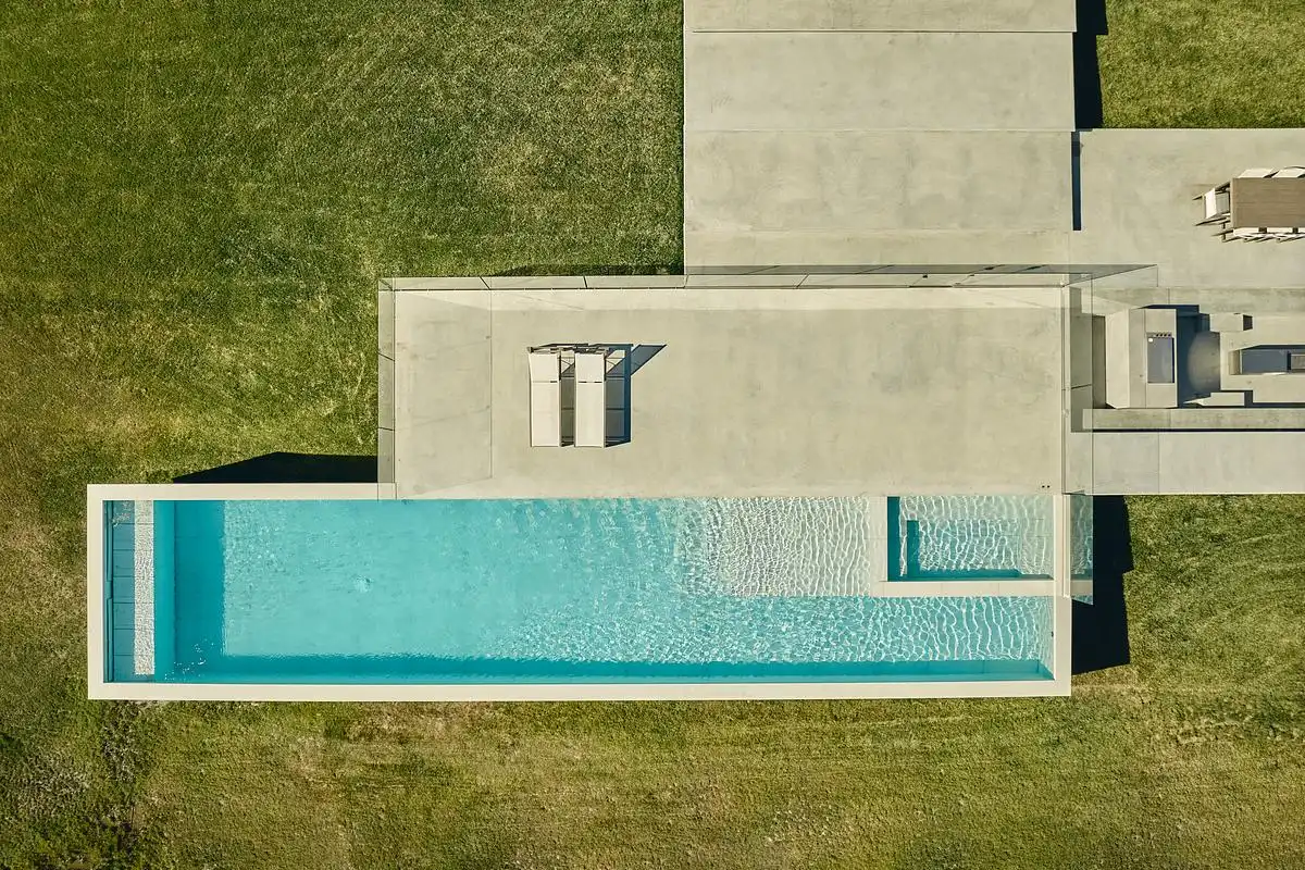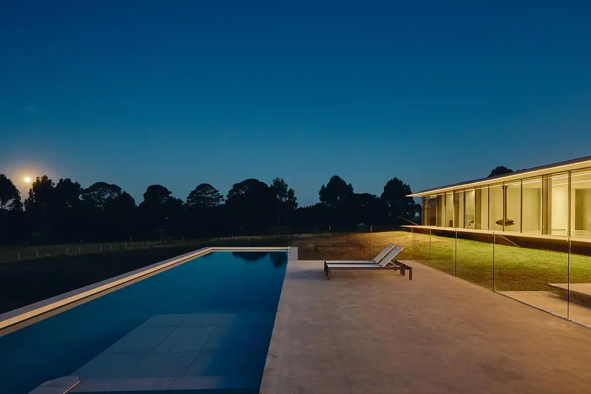 Anchored to the south and open to the north, east, and west, the home’s floor-to-ceiling glazing and floating concrete deck blur boundaries between interior and exterior, enhancing connection to the surrounding polo field and eucalypt-dotted terrain.