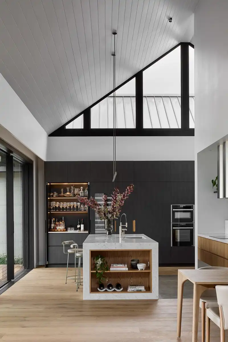 Allowing for children of all ages to have their own place – while also including a dedicated retreat area for the adults – the planning and zoning overlaid across the site allow for both a flexibility and a clear delineation when needed. The eastern side is dedicated for adults, while a central living area is defined by its lofted and vaulted ceiling, pulling people together into a light and air-filled zone that also connected visually outward. In avoiding the prevailing winds, the overall footprint is shaped in a U from above, pushing the weather to move around the home and toward the existing windbreaks within the landscape.