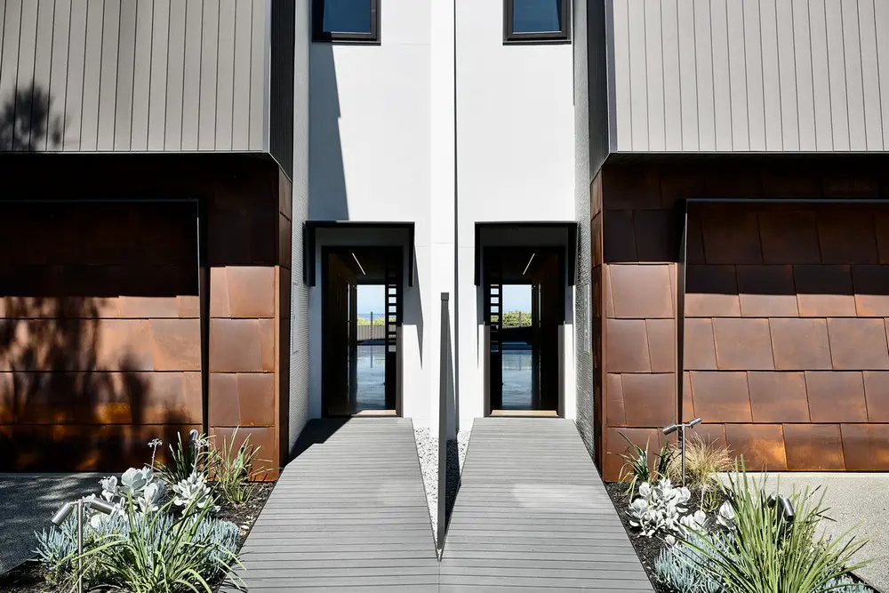 This development of two townhouses sits on a quiet cul-de-sac at one end and a beach on the other. Given the sites contextual tension between urbanism and landscape, the design is squeezed and defensive looking at one end and at the other end expands while the massing breaks down toward nature. As a response to the harsh environment at the site, the materials palette works on the premise of ‘tough on the outside, soft on the inside’; external materials are raw, robust and no maintenance, while the interior is soft on the eye and to the touch.