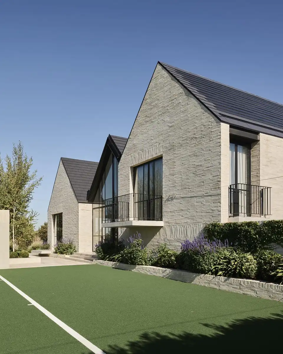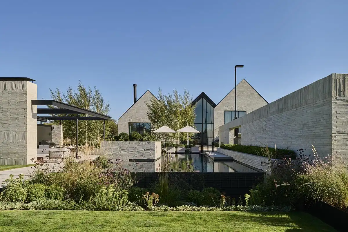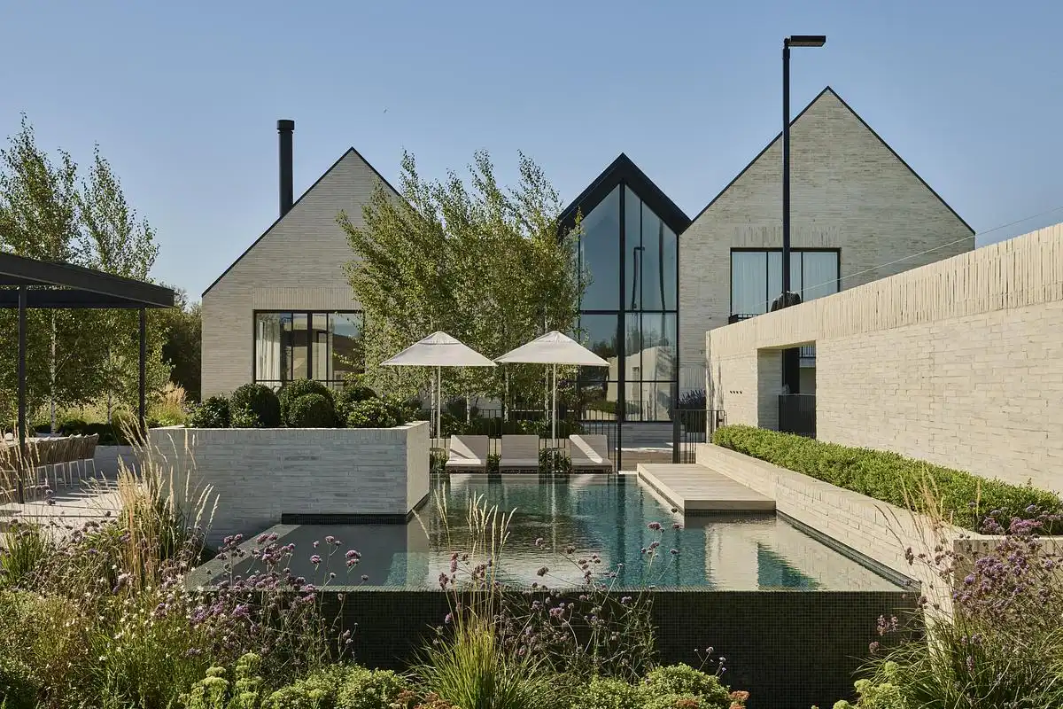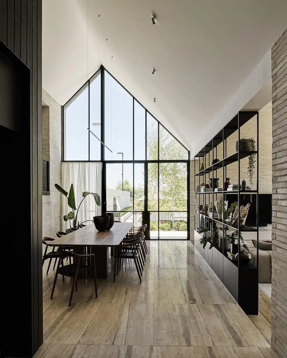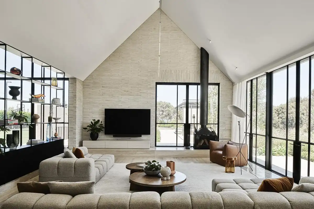 Hand-pressed bricks create texture, running seamlessly from exterior walls into the heart of the home, creating a sense of permanence and craftsmanship. Expansive natural stone flooring brings a cool, grounded luxury, while vaulted ceilings amplify volume and light.