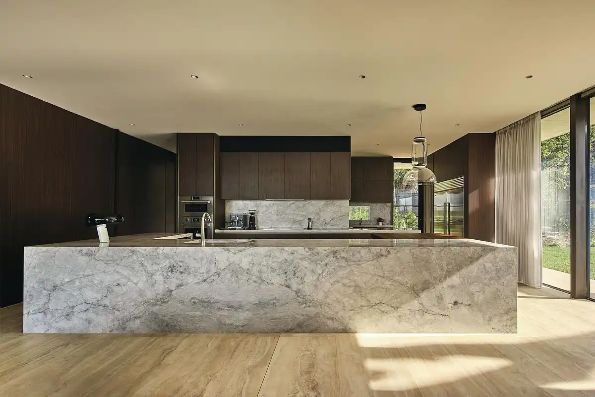 Material simplicity, muted tones, travertine floors, raw finished ceilings and lustrous rendered walls contribute an enduring elegance. Tucked below the main level, unobtrusive behind a vertical timber screen, is a capacious garage accessed by a pair of double-height doors. Stairs and lift connect to the upper level.