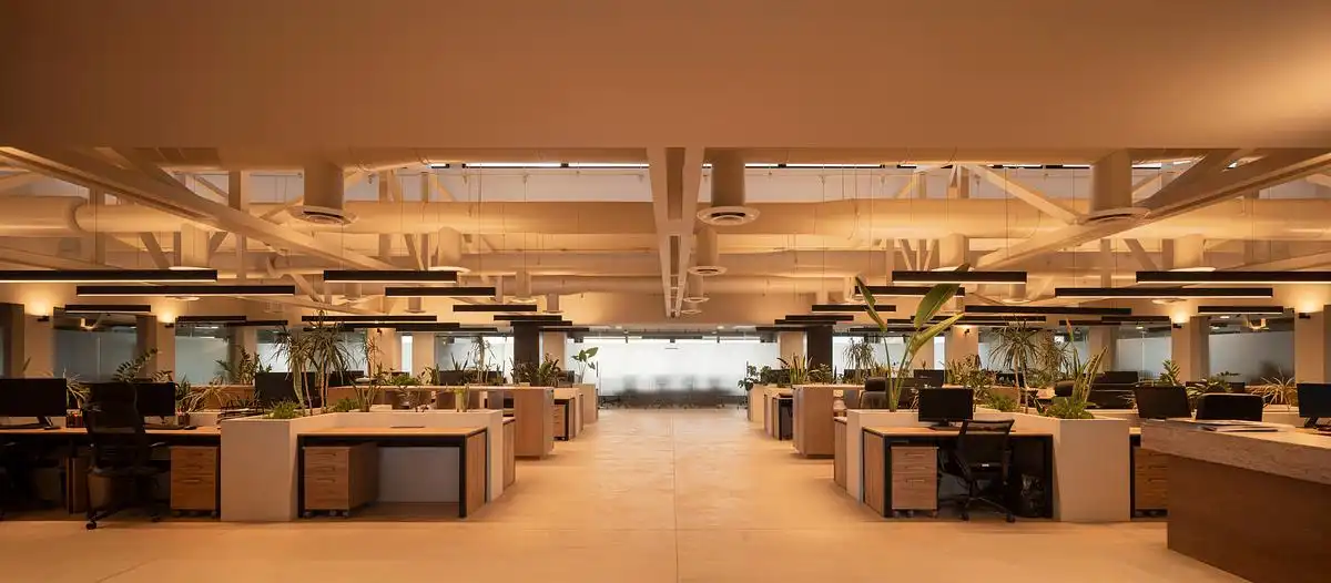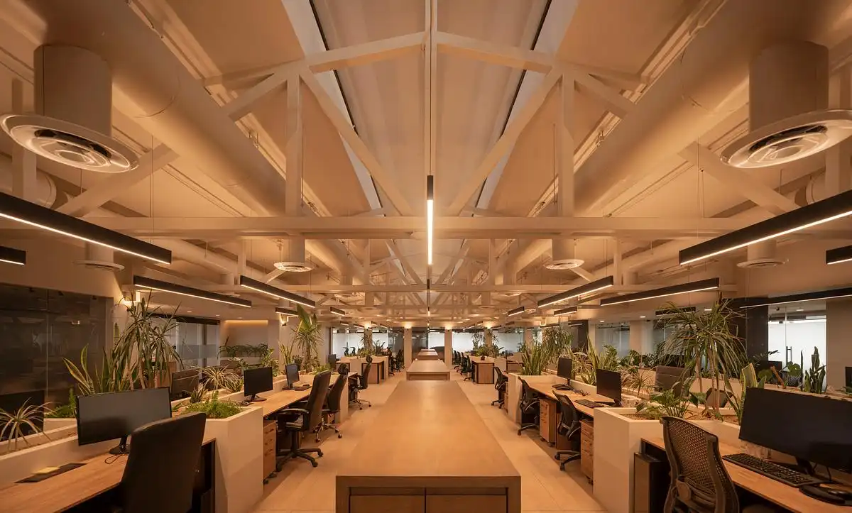 The ground level hosts a marketplace, a doctor’s office, restrooms, and a bike hub for the adjacent trail, establishing a civic and communal character. Above, the second floor accommodates offices for 80 users, organized around shared spaces and a generous open hall. A steel truss spans this central space, carrying both mechanical systems and lighting. Rather than hidden, the structure is revealed — an honest expression that contributes to the building’s refined desert aesthetic.