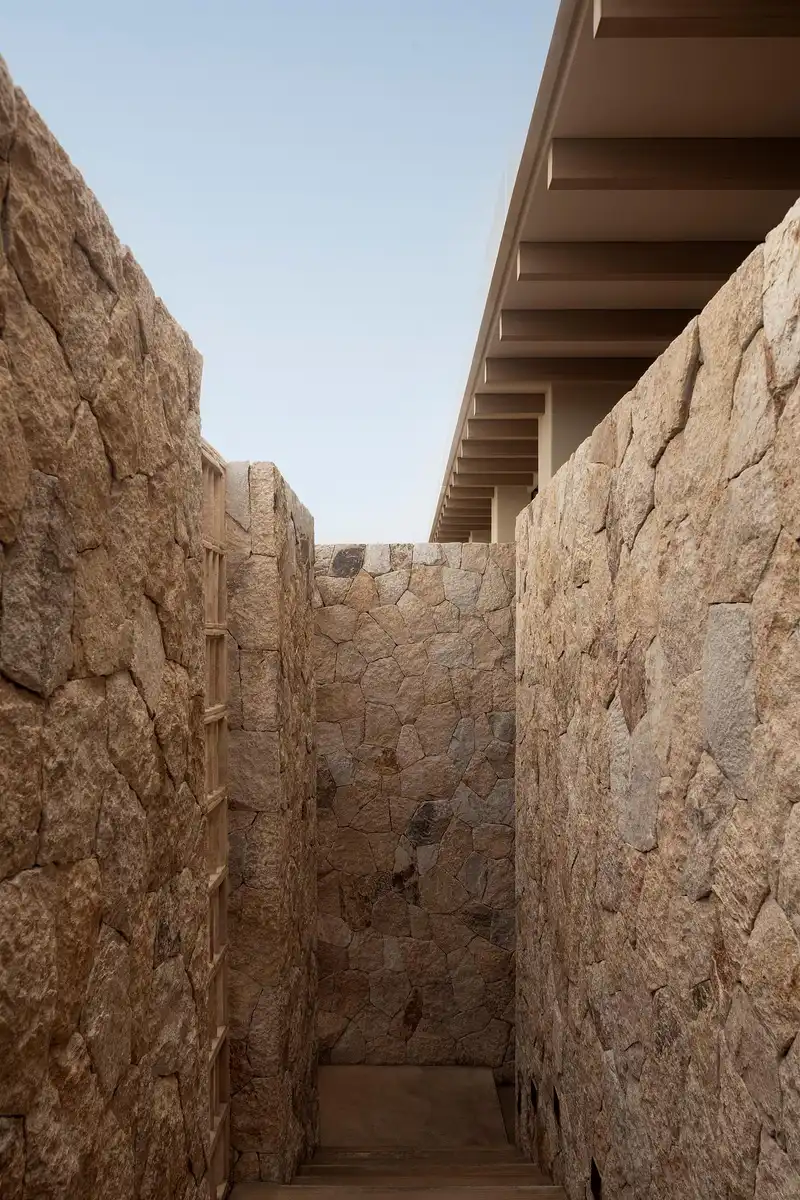 The form is weighty yet horizontal, a two-level volume that settles into the desert terrain. A continuous clerestory opening defines its upper edge, admitting light while enabling natural ventilation and passive heat cycling in response to the arid climate. In this way, the building turns environmental conditions into active design elements, creating an architecture that works with the desert rather than against it.
