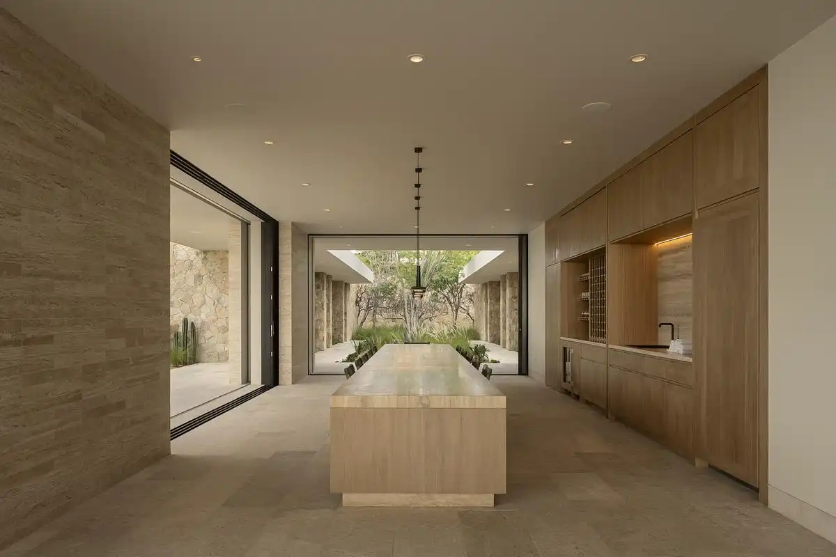In the social wing, the walls are clad in Puebla travertine, offering a soft and luminous counterpoint to the warmth of the Ojinaga stone flooring and the roof. For the carpentry, we chose the nobility of Rosa Morada wood, left unstained so its natural color could breathe.