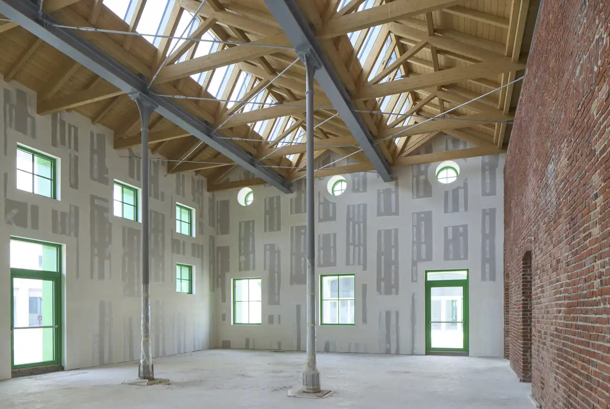 The exterior envelope and roofs of both buildings will be fully restored, and their interior structures of masonry, wood, and iron will be exposed, illustrating the neighborhood’s transformation from industrial center to contemporary urban district. Dramatic yet respectful interventions within the buildings’ interiors, like new timber roofs, mechanical systems, infrastructure for restaurant and community space, and art pieces, may also be undertaken.