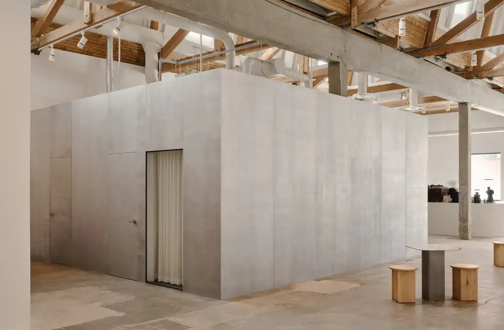 An abstract metal cube, brushed by hand, is inserted at the core of the space and organizes the gallery’s public areas, while housing its private functions without interrupting the legibility of the existing structure. The white-painted peripheral acoustic walls provide flexible exhibition surfaces and a sharp contrast with the preserved textures of the floor and ceiling. The overall approach follows principles of revalorization, material sobriety, and contextual coherence, demonstrating how the intelligent reuse of heritage buildings can meaningfully address contemporary challenges in urban development and the sustainable transformation of former industrial sites.