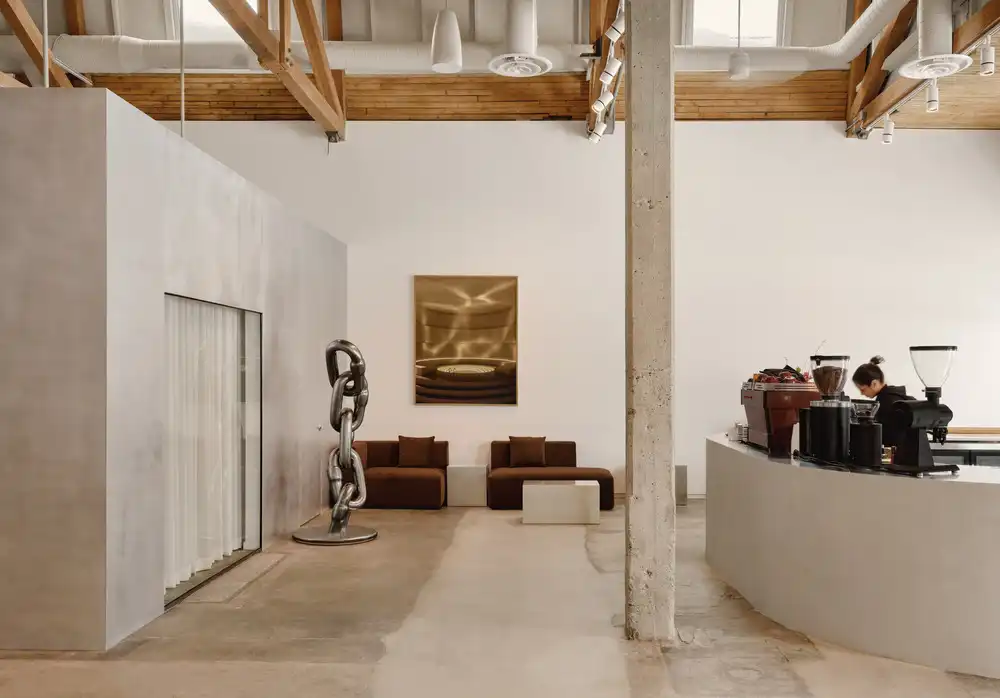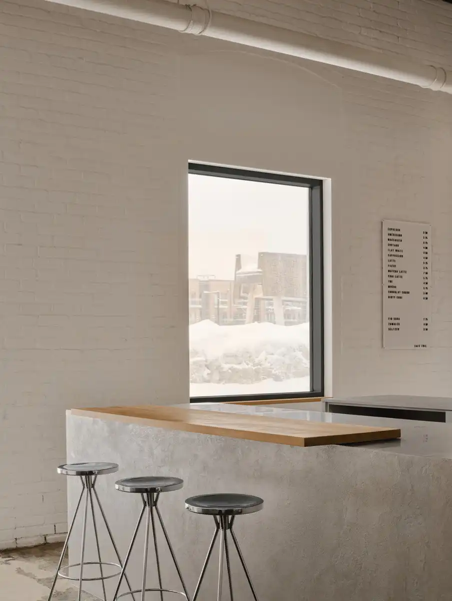 At the front of the reconverted space, a luminous café opens onto Parc des Gorilles through a large glass garage door, welcoming visitors into a setting that is both raw and refined. The curved counter, with soft minimalist lines, is finished in artisanal microcement that complements the material language of the space. At the rear, a closed projection room offers an intimate setting for audiovisual works and immersive events. The custom café furniture, produced by Montreal designer Raymond Raymond, adds a warm and sober functionalism that counterpoints to the rigour of the existing structure. The metal volume also houses a meeting room and workspace, furnished with a large table by local woodworker Essai Mobilier, and Danish Vipp chairs, articulating an aesthetic that bridges local craft and timeless design references.