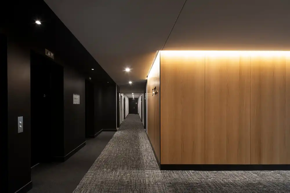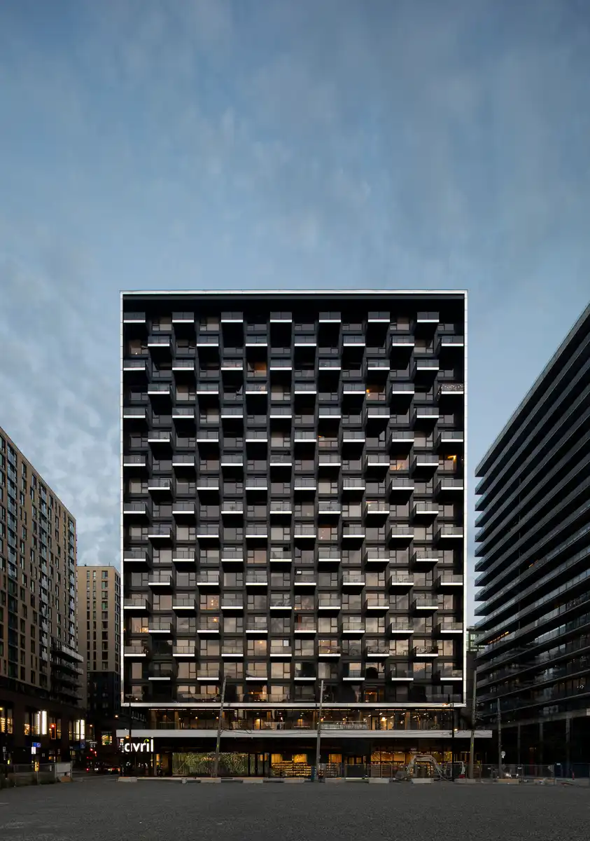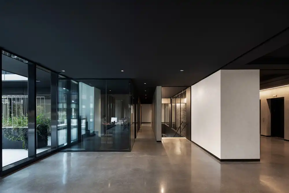 The dark tones of the street-facing façades lend a grounded and composed presence, offering a subdued counterpoint within an already visually saturated streetscape. In contrast, the white façades facing the courtyard introduce a sense of lightness and openness, enhancing visual comfort and optimizing natural light throughout the inner spaces and along the narrower stretch of Young Street.