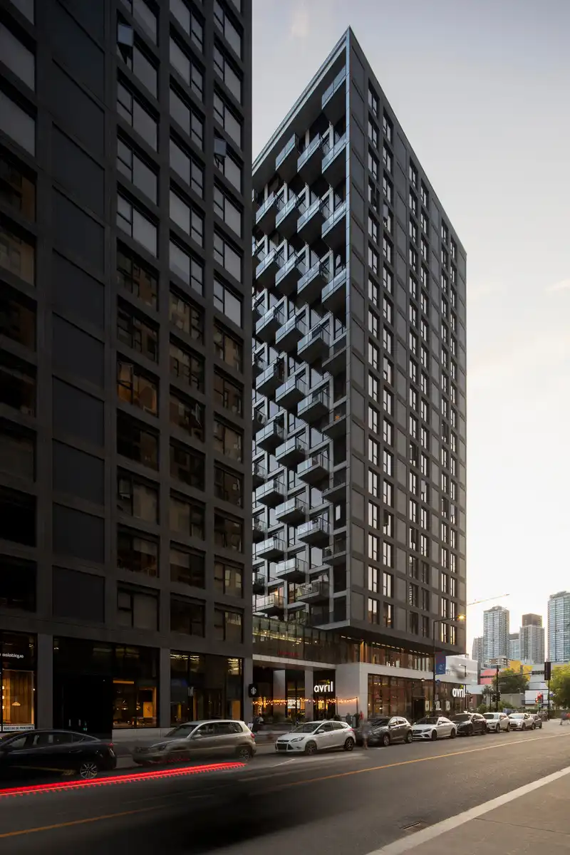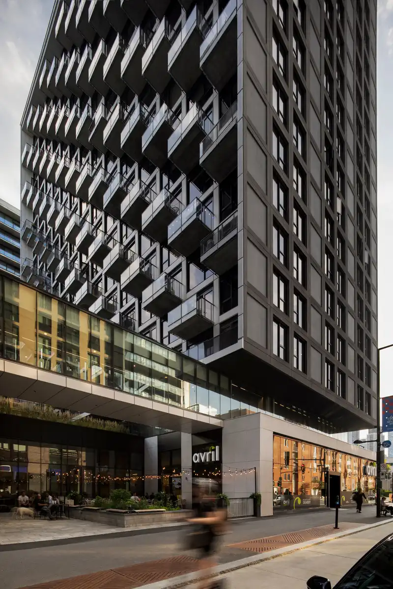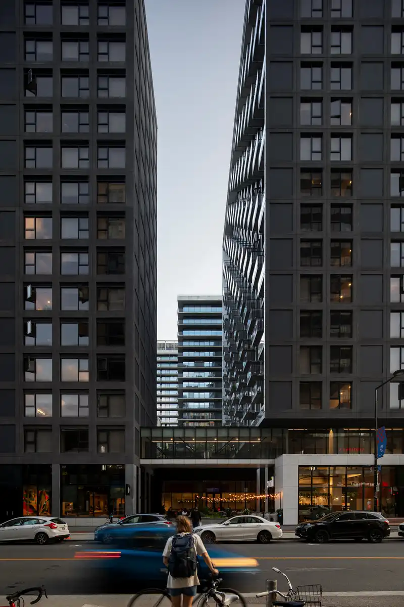 The two residential towers, standing 16 and 19 stories high, are connected by a glazed skybridge suspended above a commercial plaza that activates Peel Street. This bridge provides access to the shared amenities which, rather than being placed on the rooftop—as is often the case with ‘urban chalet’ concepts—are located on the second floor.