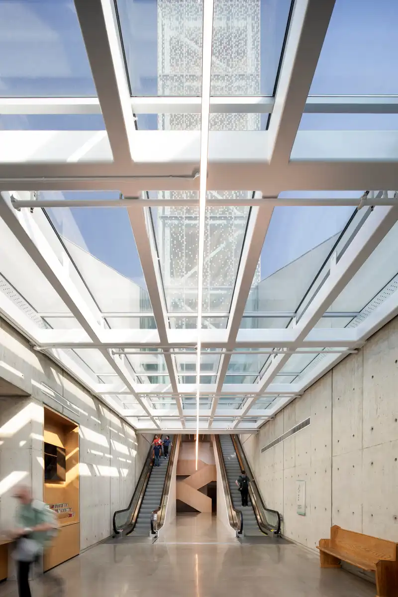 As visitors move through the pavilion, they encounter a series of curated spaces designed to evoke contemplation, engagement, and wonder. The cafeteria, perched high above the landscape, offers panoramic views that invite moments of pause and appreciation. Newly created public squares and sacred gardens encourage quiet reflection, seamlessly integrating with the building’s design. A rhythmic sequence of skylights and illuminated ceilings subtly guides movement, enhancing a natural flow through the space. These openings establish a dynamic relationship between the interior and exterior, revealing fragments of the surrounding context and connecting the building to its history and environment.