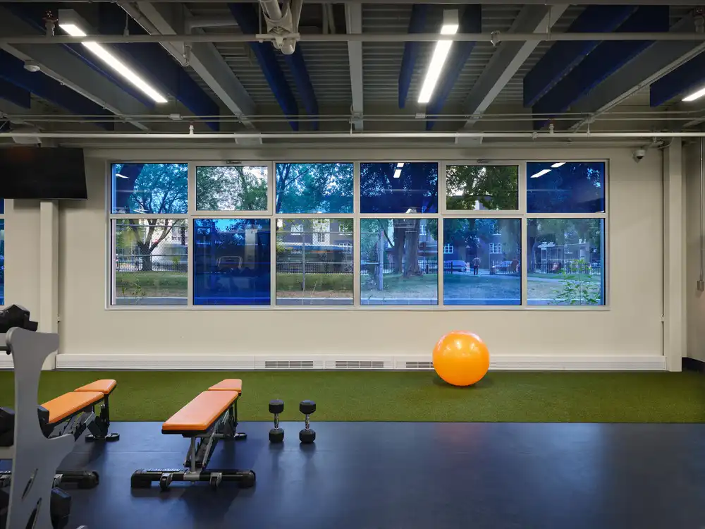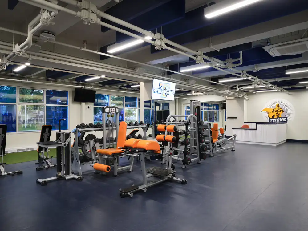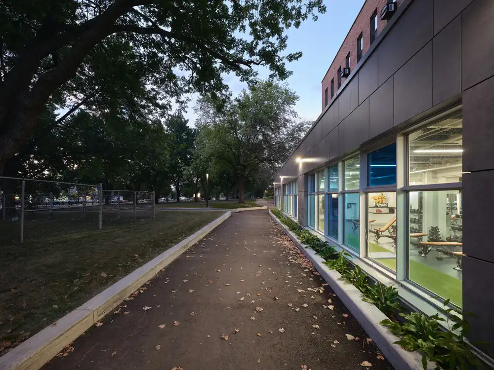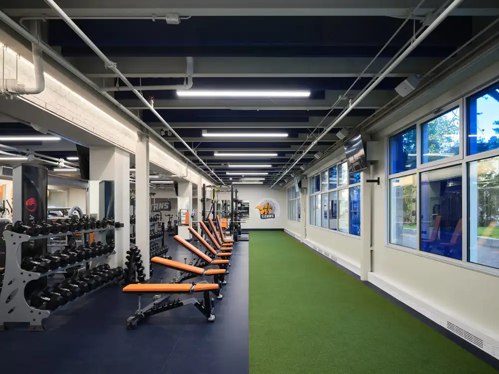 Inside, the transformation of the outdated locker rooms and the extension outward made it possible to create a modern, bright training room tailored to the specific needs of the College’s athletic programs.