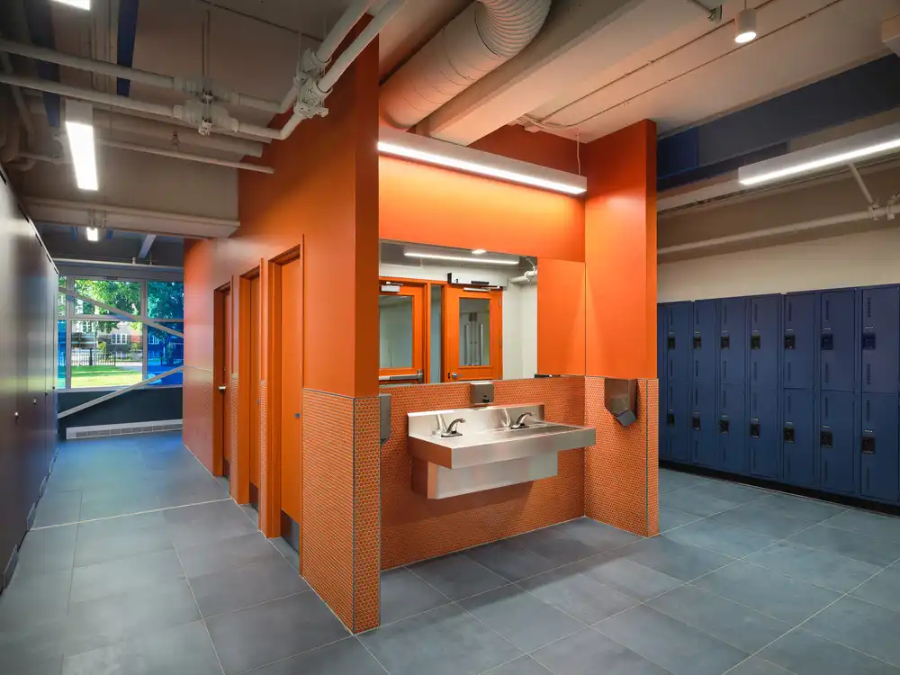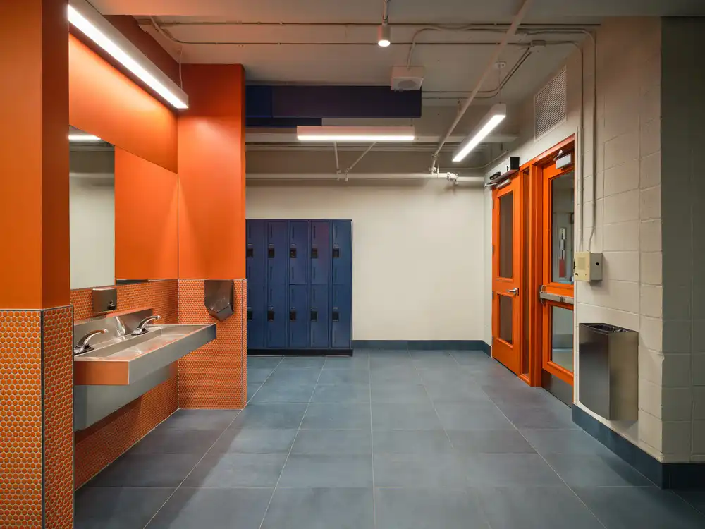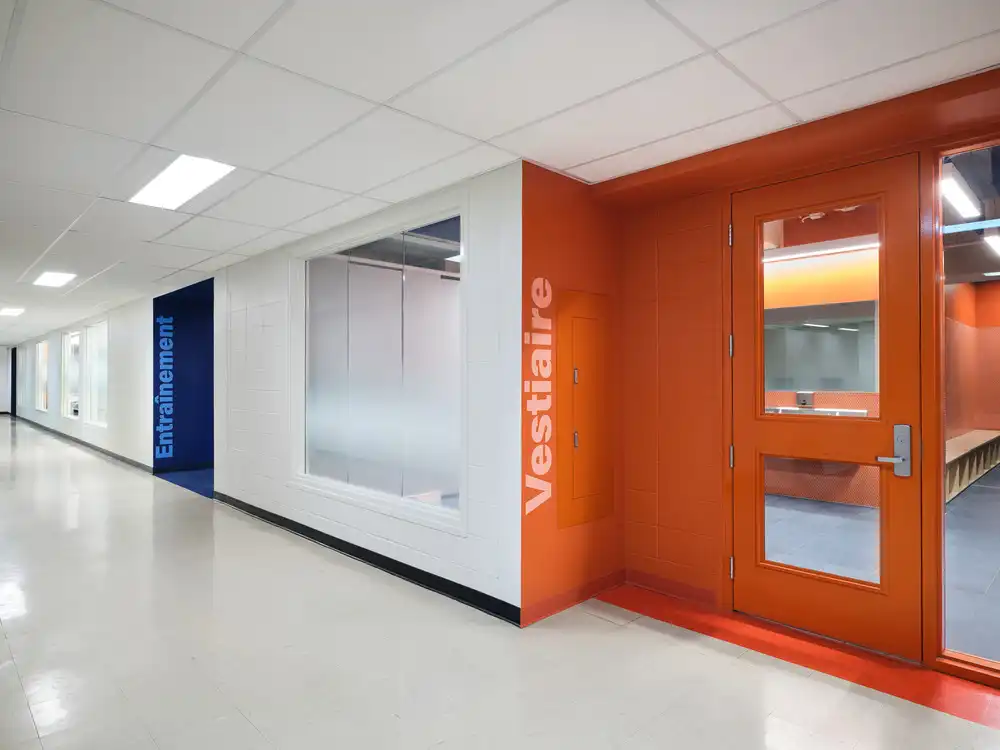 The interior showcases a vibrant colour scheme with tones of orange and blue, reflecting the athletic identity of the Collège Reine-Marie Titans. Exposed ceilings and structural elements give the space a raw yet refined aesthetic, well-suited to its dynamic nature.
