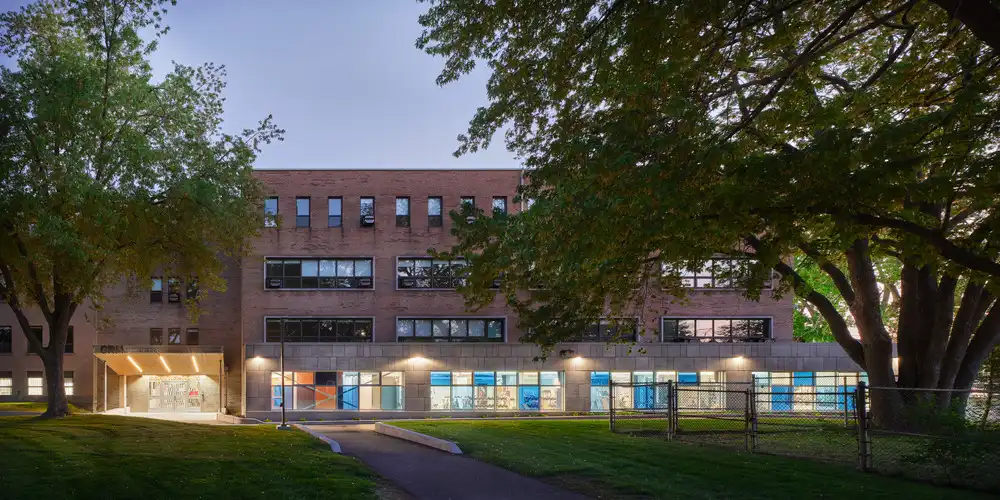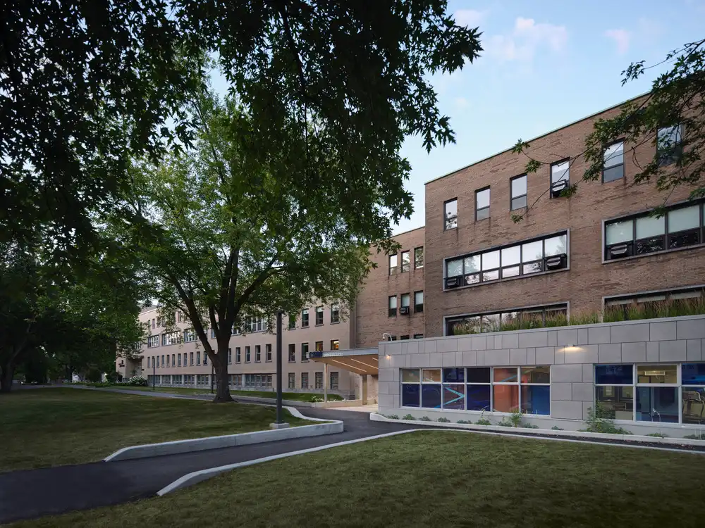 In the heart of Montréal’s Saint-Michel district, Collège Reine-Marie, a secondary school, affirms its commitment to a forward-looking education, notably through its specialized profiles in sports and the arts. Deeply human, inclusive, and oriented toward the overall development of young people, it places individual fulfillment at the center of its educational mission. It is within this spirit of continuity and innovation that the expansion and redevelopment project of the student entrance takes place, designed as a structuring, welcoming, and inclusive space.