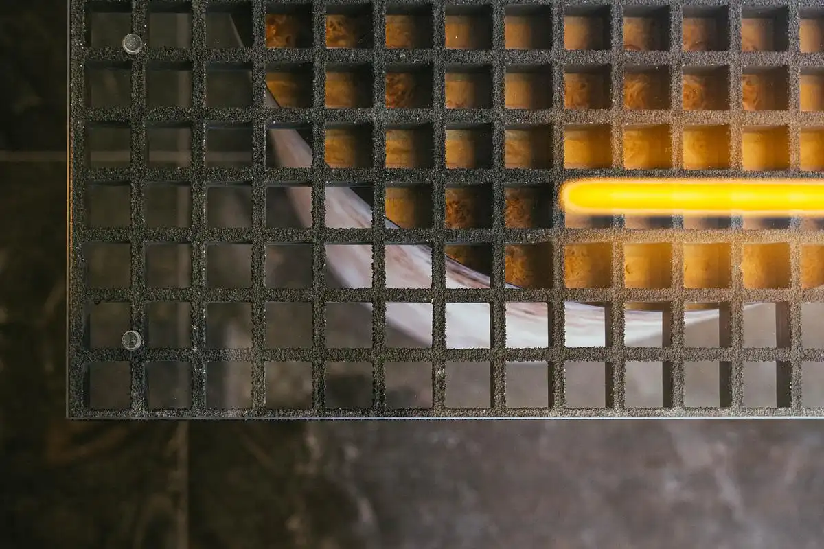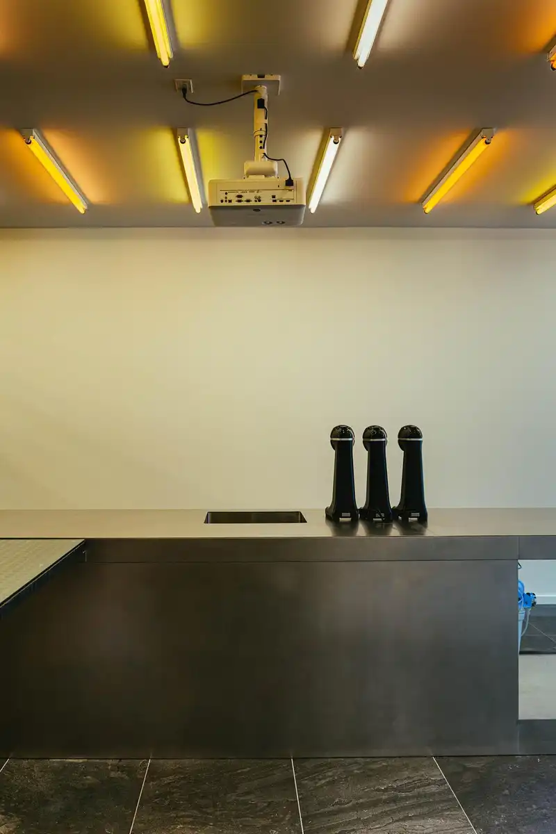 The design concept centers on transparency, both literal and philosophical. Every piece of machinery, every filtration system, and even the back-of-house lab is placed in clear view. The idea is simple: when you’re onto something real, there’s nothing to hide. Inspired by the Centre Pompidou and science-fiction aesthetics, the space boldly exposes its mechanics and elevates them into design features.