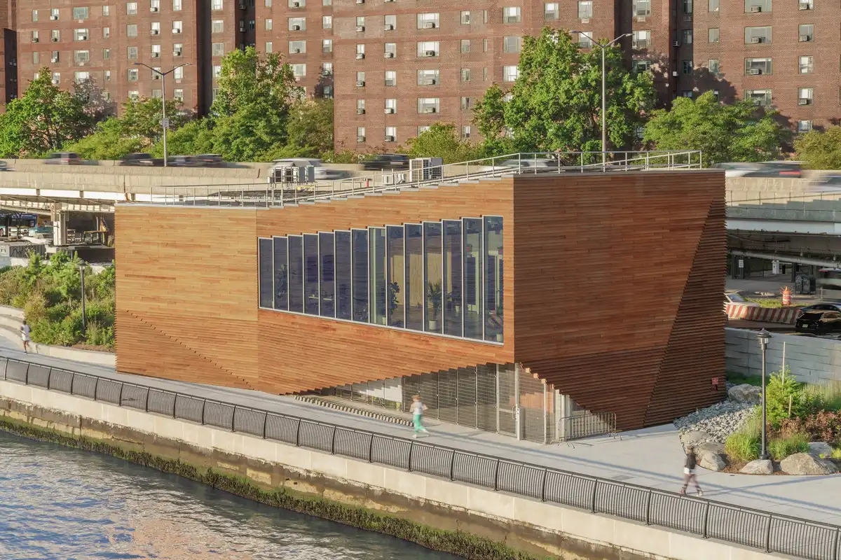 Standing as the northern gateway to ESCR at East 23rd Street and Avenue C is the new Solar One Environmental Education Center – designed by BIG with the NYC Economic Development Corporation (NYCEDC), Gilbane Building Company, TYLin (formerly Silman), Cosentini Associates, MNLA, and others. As the city’s first building to include ground-up solar photovoltaics and battery storage, the 6,409-sq-ft timber-clad facility replaces the former Solar One building, which became a vital refuge during Hurricane Sandy by providing solar charging power to local residents when the grid failed south of 34th Street. Today, the two-story center expands Solar One’s mission to deliver environmental education, training, and technical assistance across New York City, including flexible classrooms for K-12 STEM educational programming for NYC Public Schools and community events.