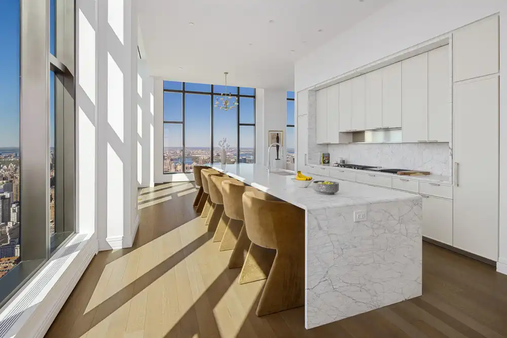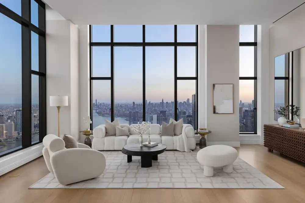 Juul-Hansen’s design carries this hand-crafted approach inside the building. Each of the 120 corner residences—ranging from one to five bedrooms—features at least two exposures and expansive floor-to-ceiling windows framing sweeping views of the East River, Midtown skyline, and beyond. Interiors boast wide-plank oak flooring, ebonized oak entry doors, and custom wainscoting. Primary bathrooms feature radiant-heated floors, Laufen soaking tubs, Waterworks fixtures, bookmatched Calacatta Gold slab floors and backsplashes, and sinks carved from single blocks of Bianco Dolomiti marble. Kitchens are anchored by Statuarietto marble islands, Sub-Zero and Wolf appliances, and custom Italian cabinetry.