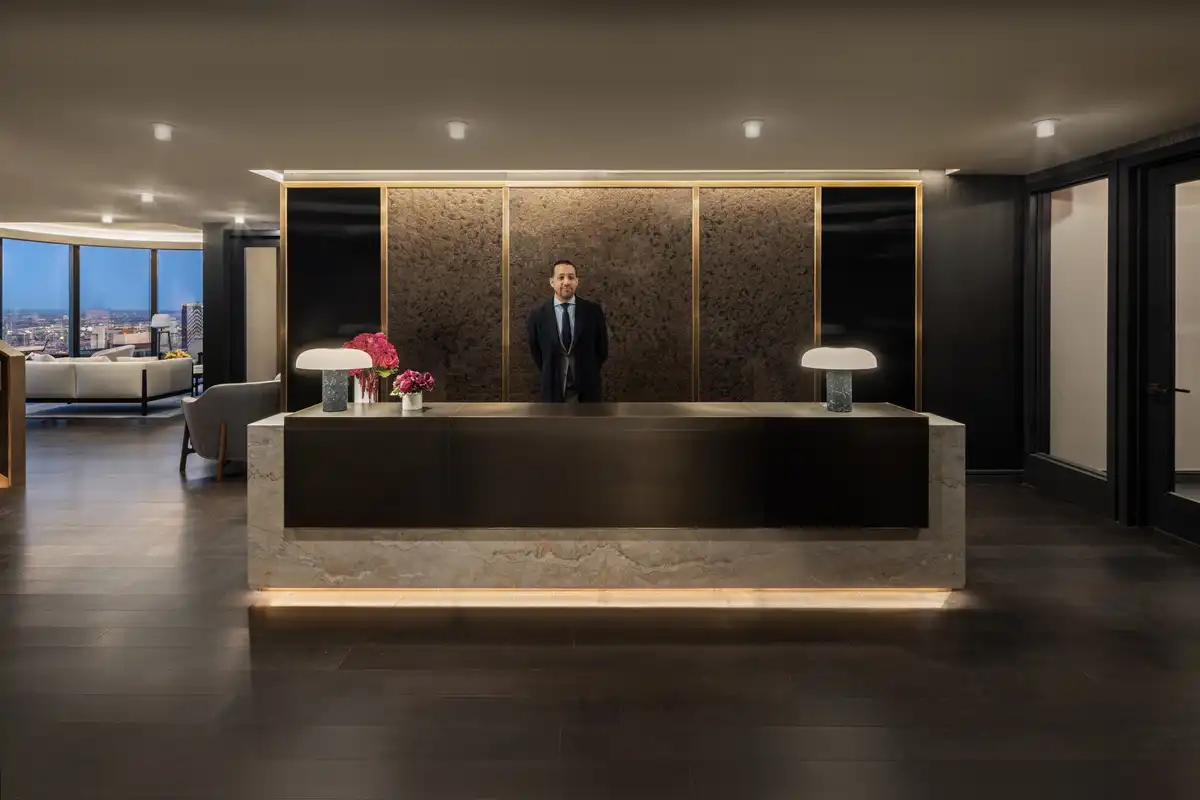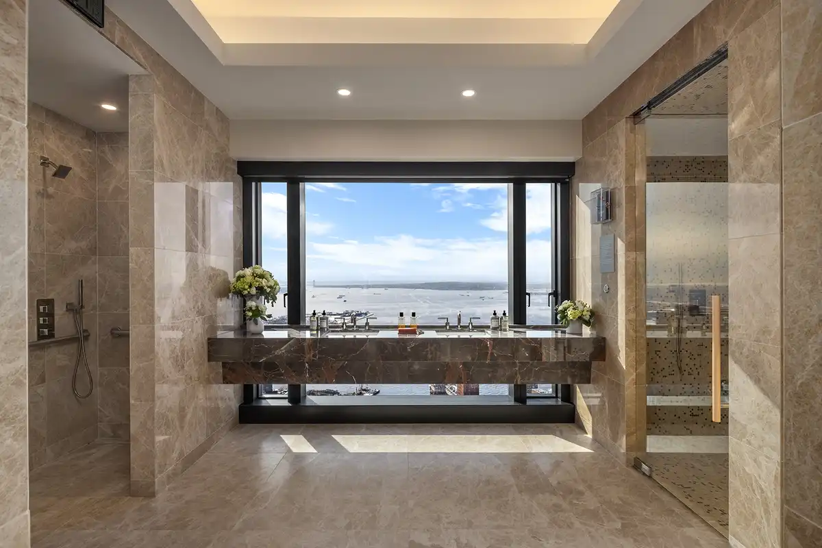 The tower’s entrance is marked by an expansive triple-height lobby, soaring over 26 feet, and adorned with a custom chandelier. Richly decadent, the lobby’s interior features three distinct types of marble, a fireplace that creates an ambience of warmth upon arrival, and a soaring library featuring custom millwork and an open book display. The Lobby’s front desk references the surrounding water in New York Harbor, with an electric blue hue. Behind the front desk, a large ‘X’ can be visible within the Noir Saint Laurent marble, which provides a nautical nod to MAWD’s background designing the interiors of superyachts. Accentuating the lobby’s verticality, bronze elevator banks reach up towards the ceiling, punctuated by Arabescato Carrara marble-clad walls.
