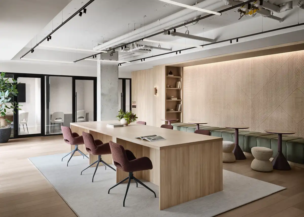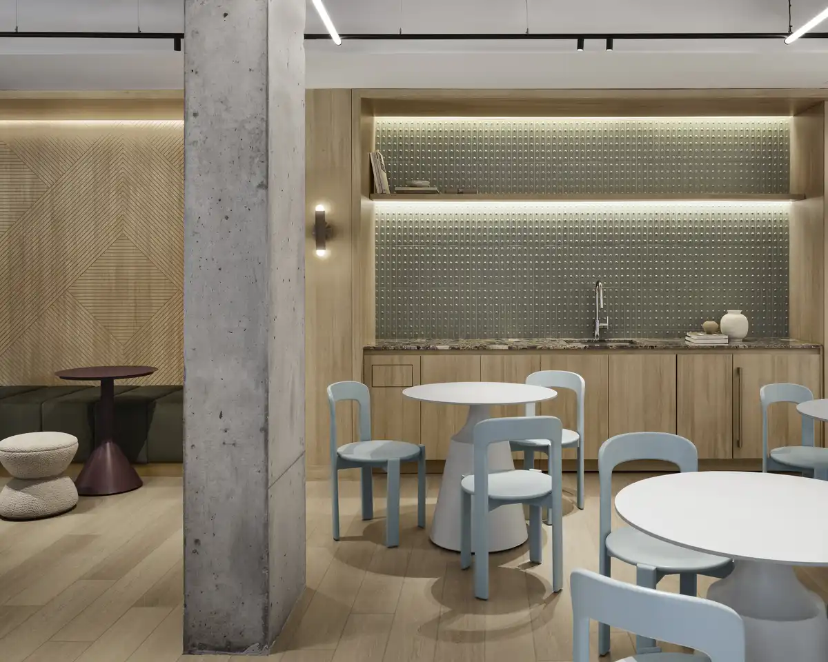 Union Channel’s dynamic façade—composed of glass, exposed concrete, and metal panels—embraces the neighborhood’s industrial context, while undulating bay windows establish a 21st-century landmark that animates the street edge. Inside, a palette of natural materials, including white oak, travertine, and terrazzo, delivers durability, craft and warmth.