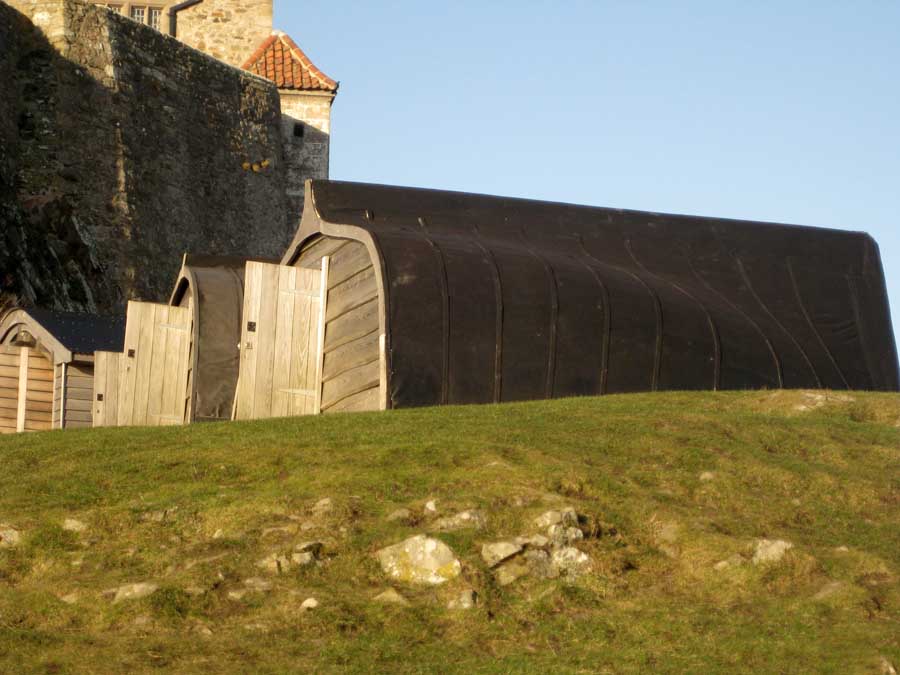 Upturned boat – shed typical for Holy Island; Lindisfarne Castle from east