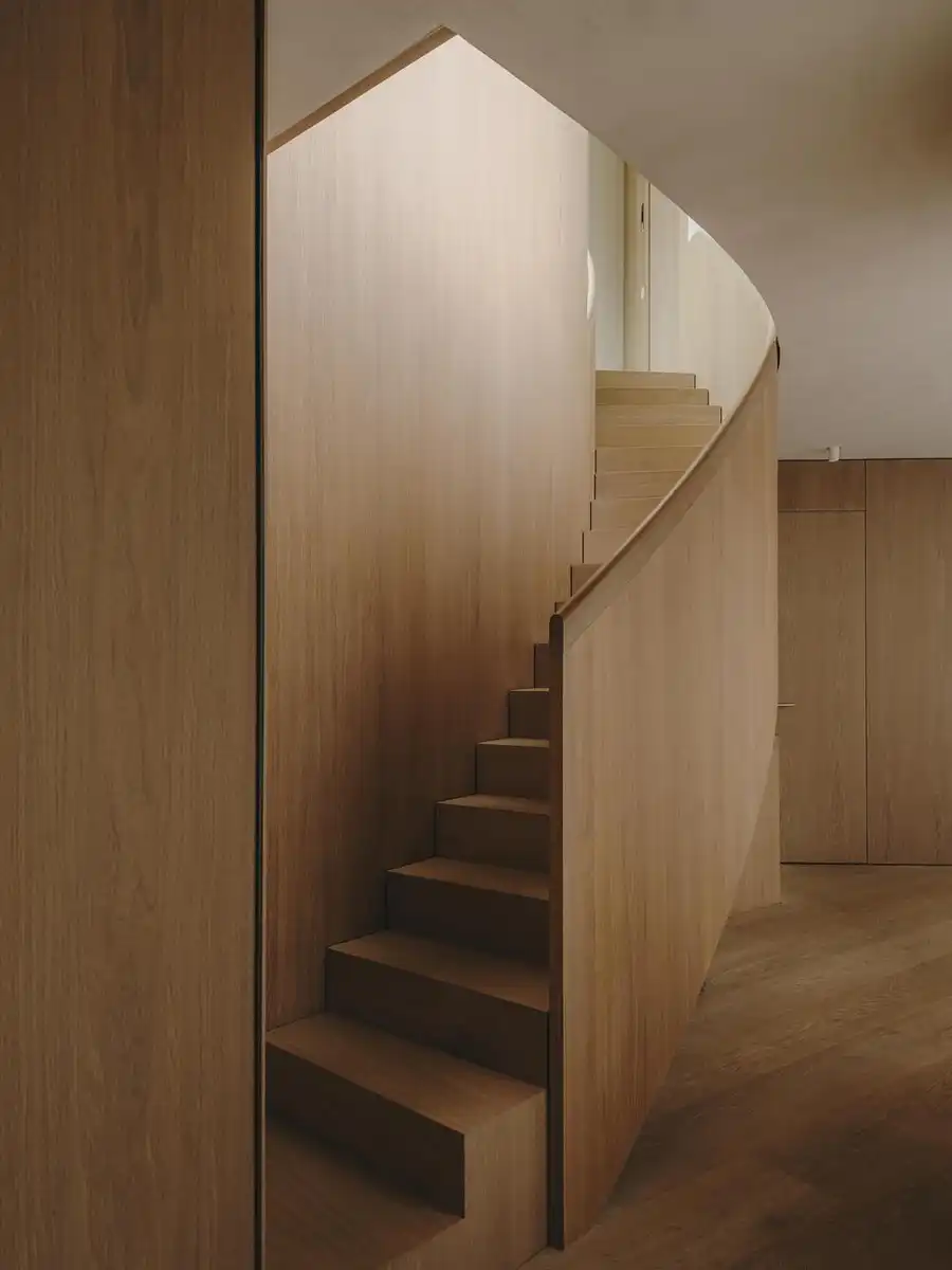 The house spans four floors, including a small basement, and measures approximately 3,800 square feet with a private garden at the front. Its central feature is the undulating staircase, which acts as the spine of the home and introduces natural light from the skylight above. In warm weather, the doors open to the garden, shifting daily life toward indoor–outdoor living. The house includes four bedrooms and four bathrooms for a family of four.