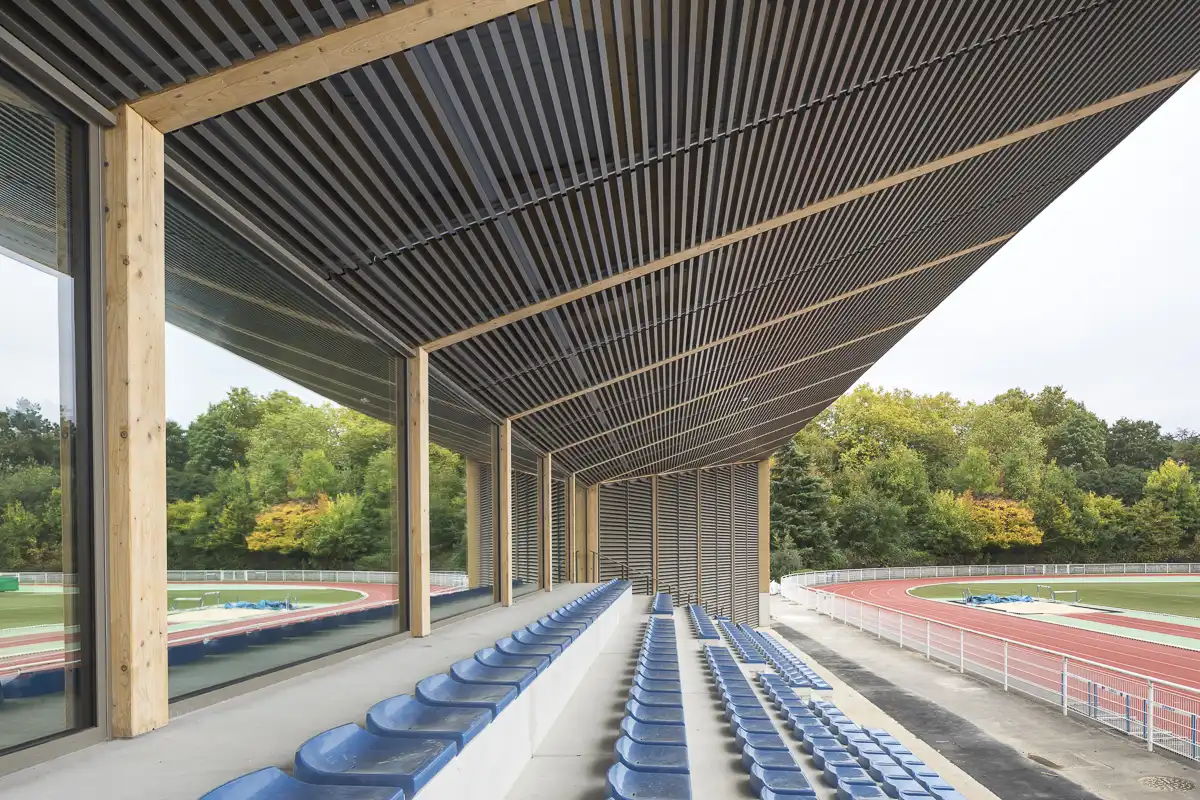 The sports complex naturally extends this architectural language. Its 300-seat grandstand, perfectly oriented, ensures optimal viewing comfort. Its gently sloping roof lowers toward the leisure area, preserving light and views within the courtyards. Integrated into the whole, it reinforces the idea of a shared, intergenerational, and open public space at the heart of the city.