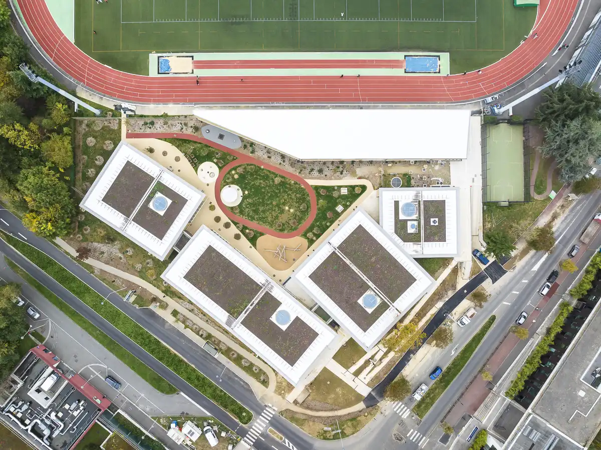 Perfectly integrated into the site’s natural topography, the project follows the slope without artificial alteration. Five entities—nursery, elementary school, childminders’ hub, cafeteria, and sports stand—are arranged around a central garden courtyard, sheltered from the street yet open to the landscape.