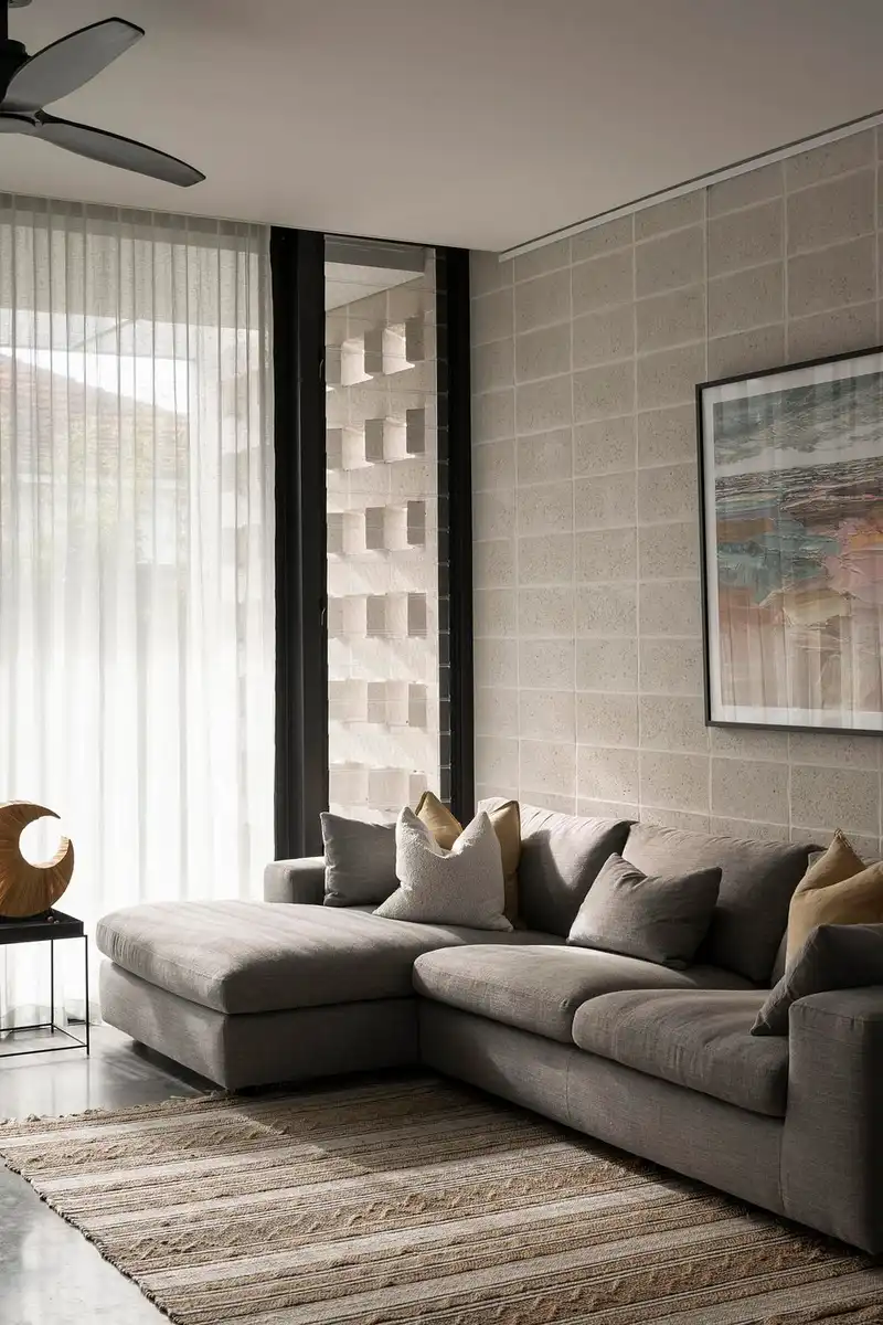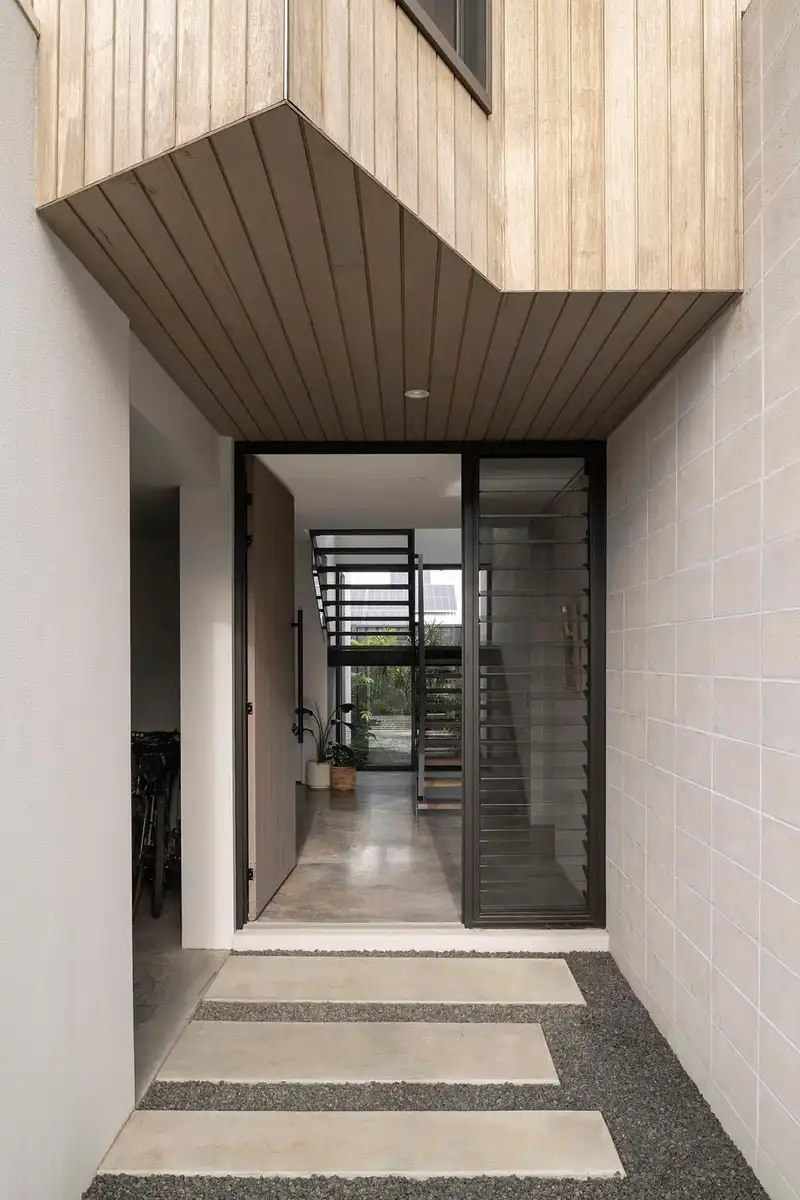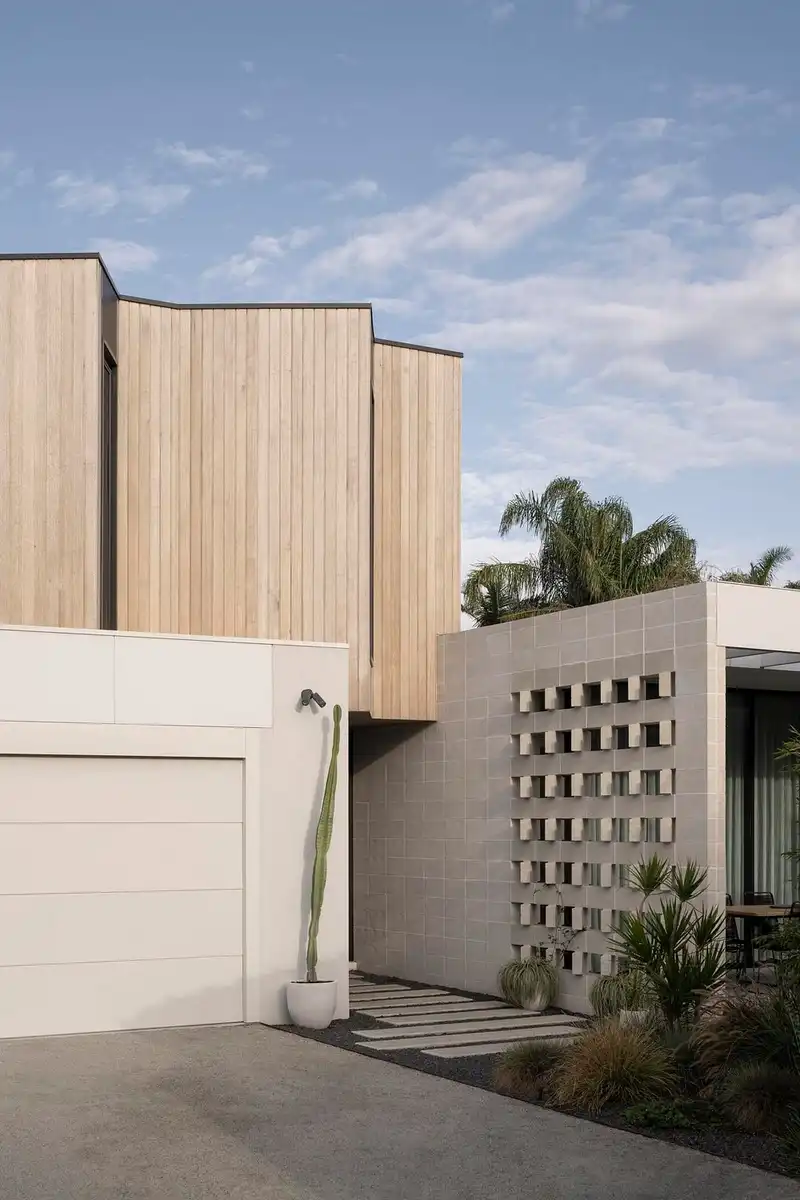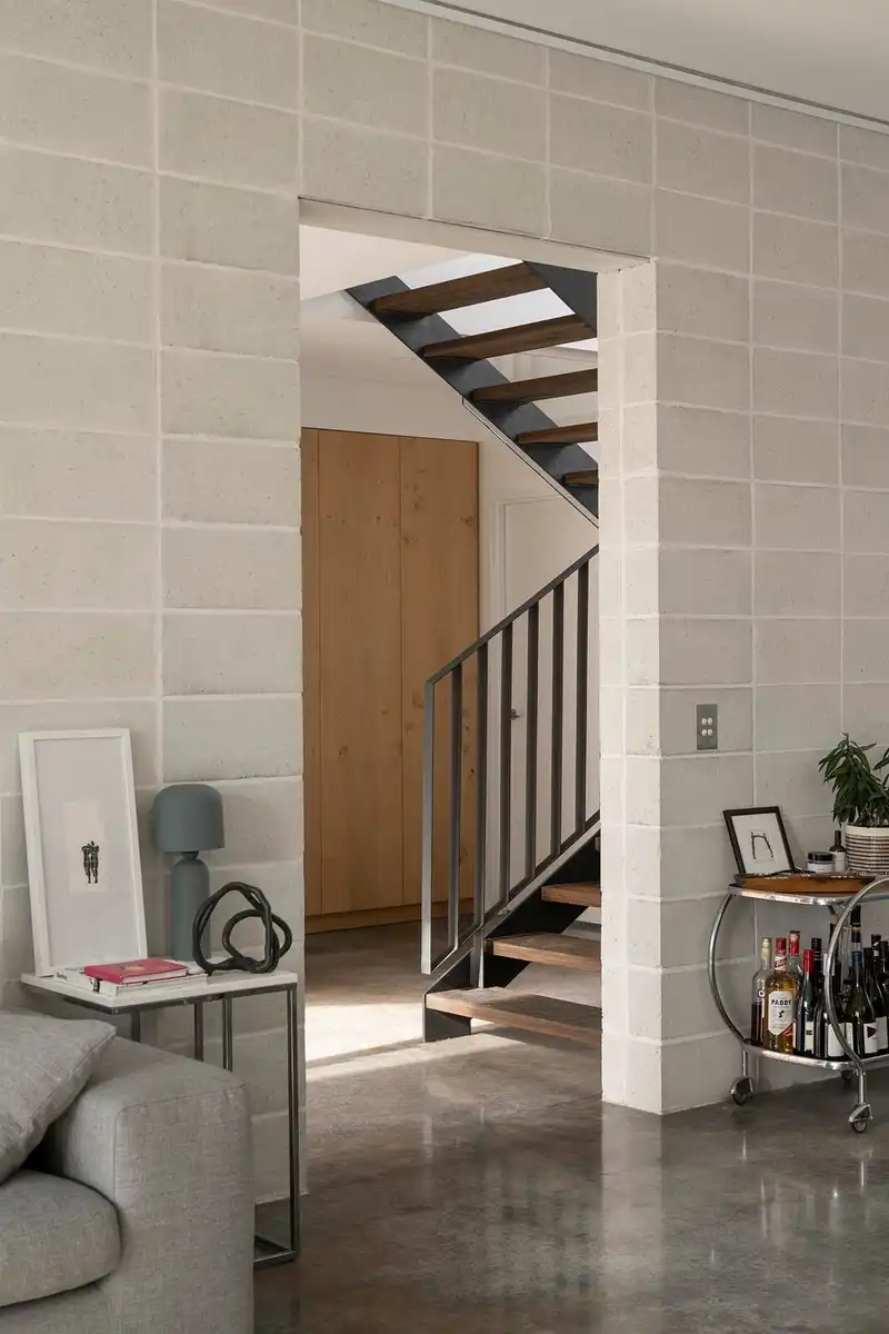 A council requirement was to have direct views into the living areas when approaching the home. The angled blockwork was designed to allow for views of guests on approach while also blocking the views of cars from the living areas.