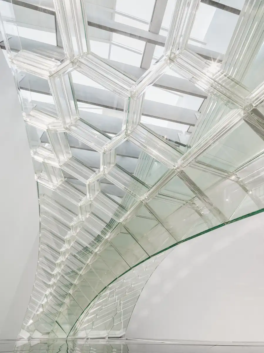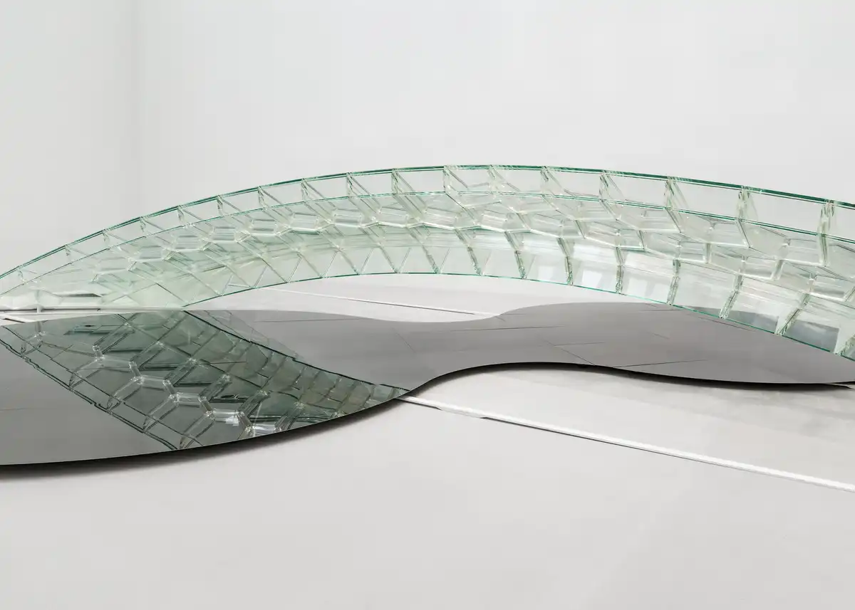 Built from 124 hollow elements of ultra-thin glass (just 16 mm thick), the bridge proves that lightweight glass structures can be strong, sustainable, and elegant. Each glass piece was manufactured with a precision of 10th of a millimeter and precisely assembled, and joined with acrylic connectors to form a compression-based system that needs no heavy metal frames or additional connections. The entire structure can be disassembled and recycled, which is a step toward circular, low-impact construction.