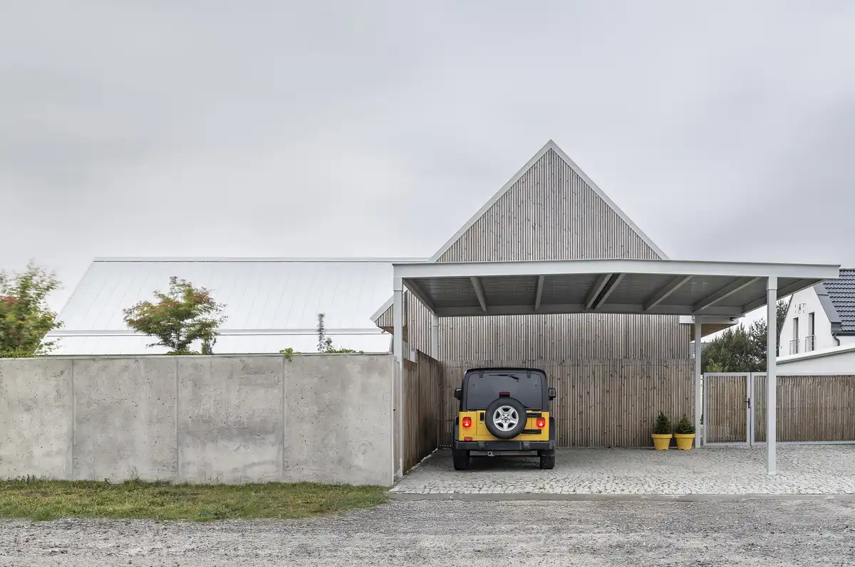 At the heart of the house lies a single, spacious room combining kitchen, dining and living areas beneath an open ceiling. It is the meeting point of the family’s everyday life — a bright and lofty space that encourages togetherness. The second wing houses the children’s rooms, arranged in sequence and extended by compact mezzanine levels beneath the roof, turning them into playful private zones. The main bedroom also adopts an open ceiling, expanding both air and light.