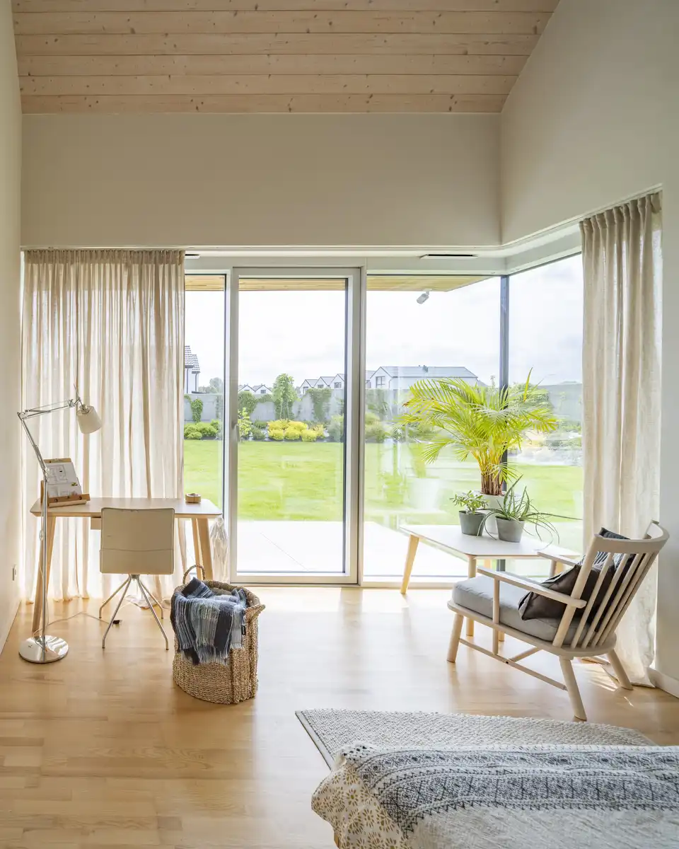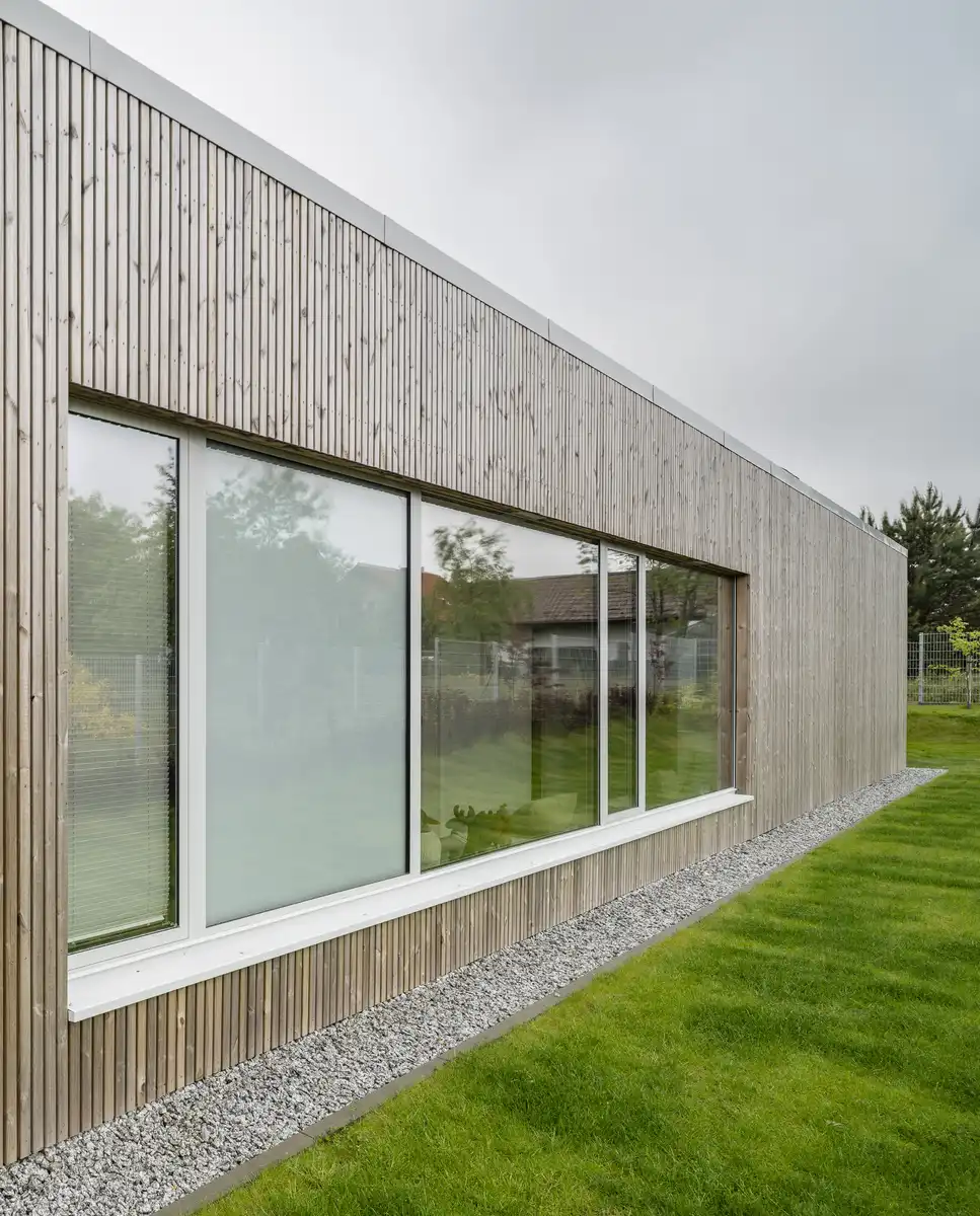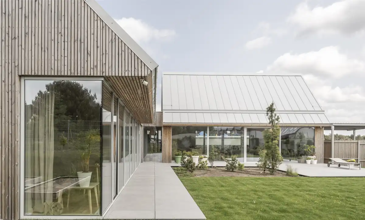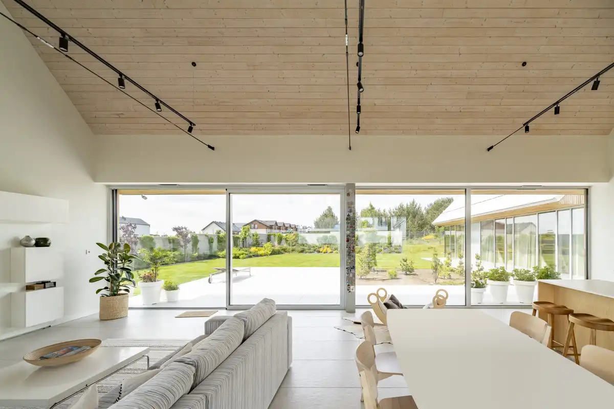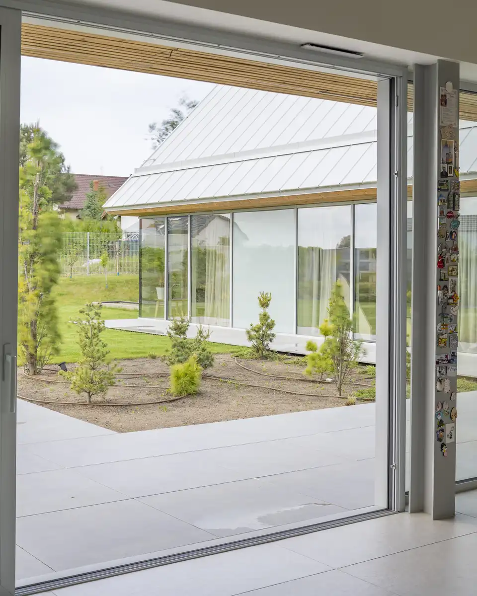 Oriented south and west, the living and bedroom wings open wide to the courtyard through full-height glazing, allowing sunlight to flood the interior throughout the day. Oversized windows and sliding glass doors provide direct access to the garden from every bedroom and the main living room, blurring boundaries between inside and out. A subtle, sculptural overhang runs along the glazing and entrance zone, tempering the sun and giving the façades a refined, linear accent.